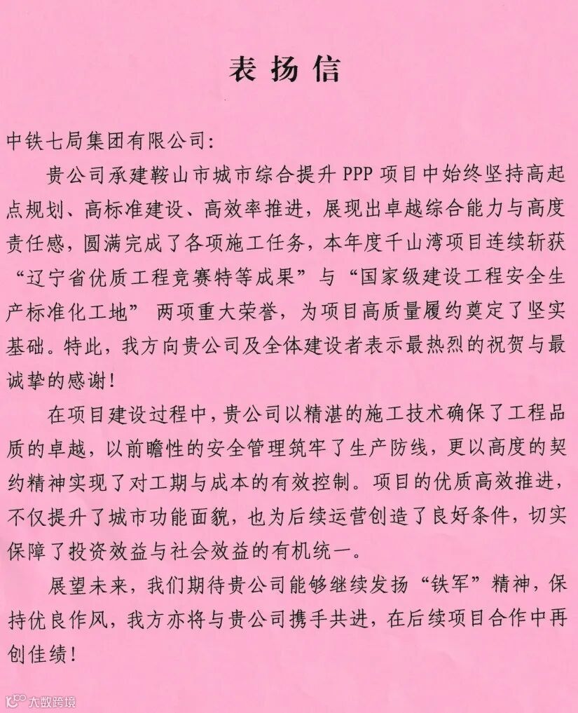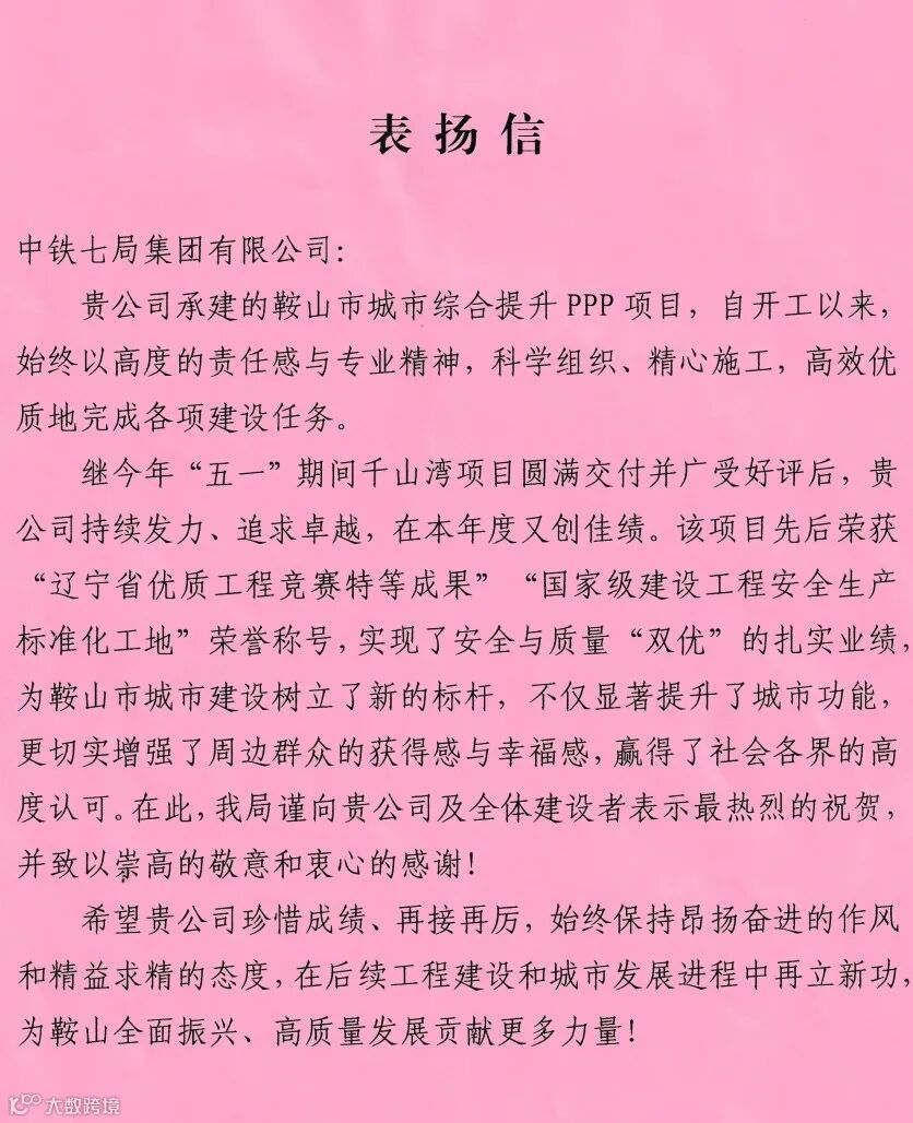 两封表扬信,既是荣誉,更是激励。中铁七局将以此为动力,在后续建设中持续追求卓越,为城市发展再立新功。