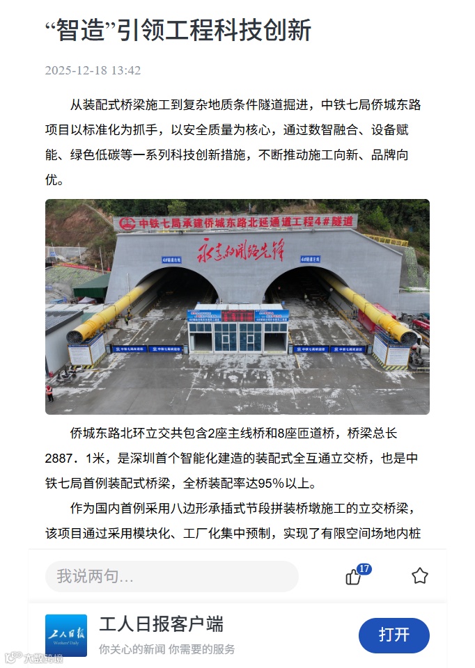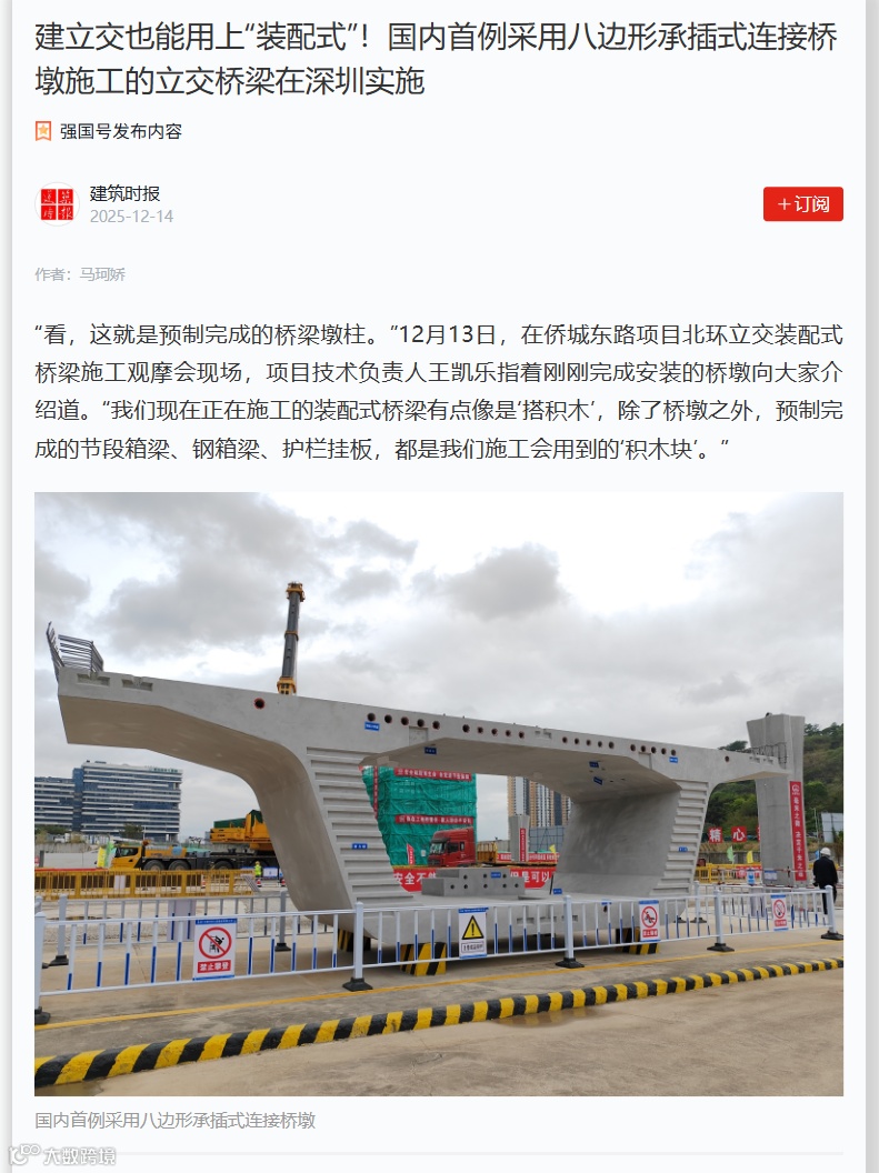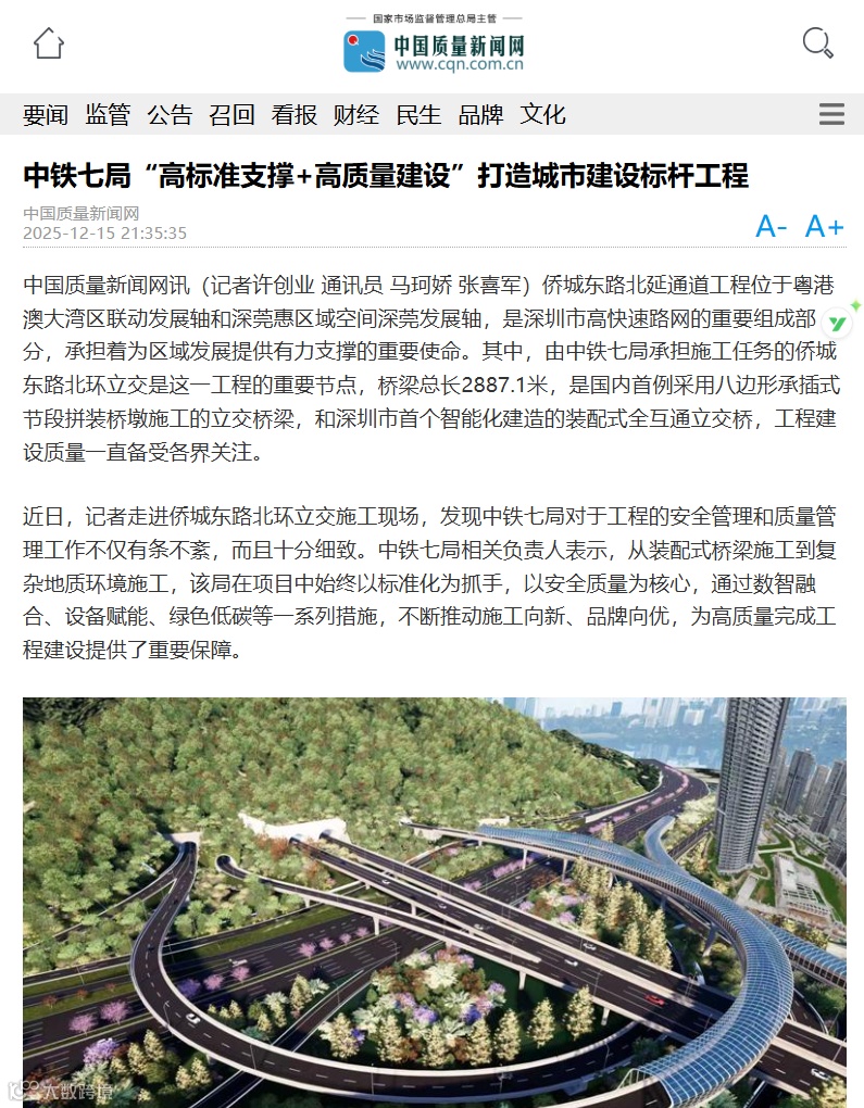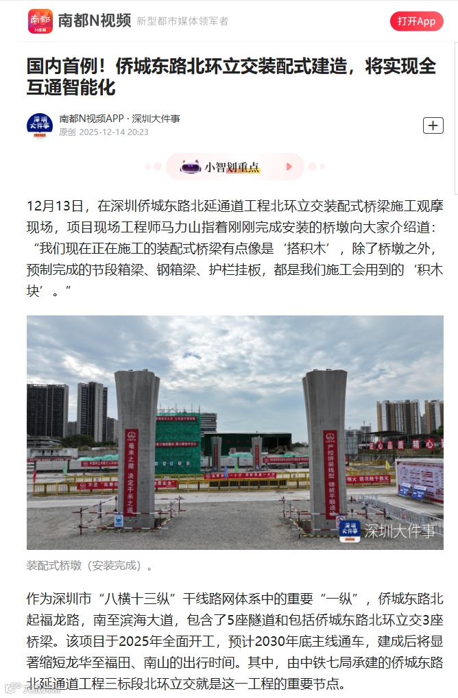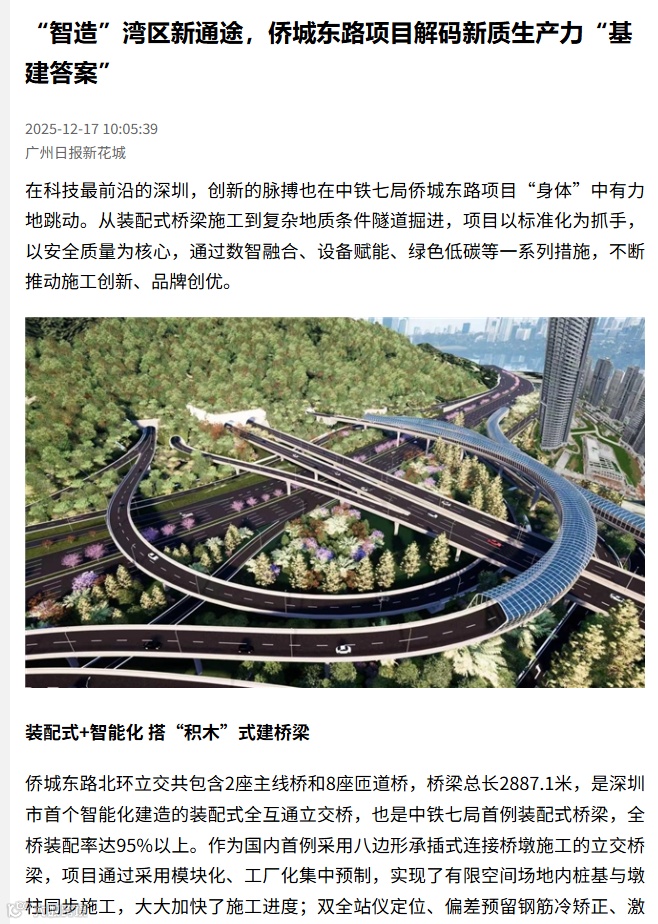 12月13日,多家媒体走进中铁七局深圳侨城东路项目施工现场,共同近距离观摩项目“装配式”桥梁施工和智能化建造情况。该项目创新施工技术融入工程建设受到了光明日报、科技日报、工人日报、学习强国、中国企业报、深圳商报等多家中央及省(市)各级媒体关注报道,充分彰显了企业优质建造的能力与品牌。