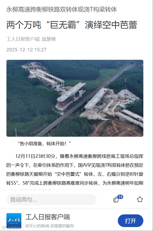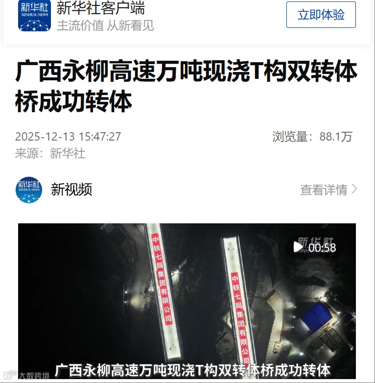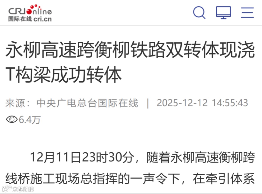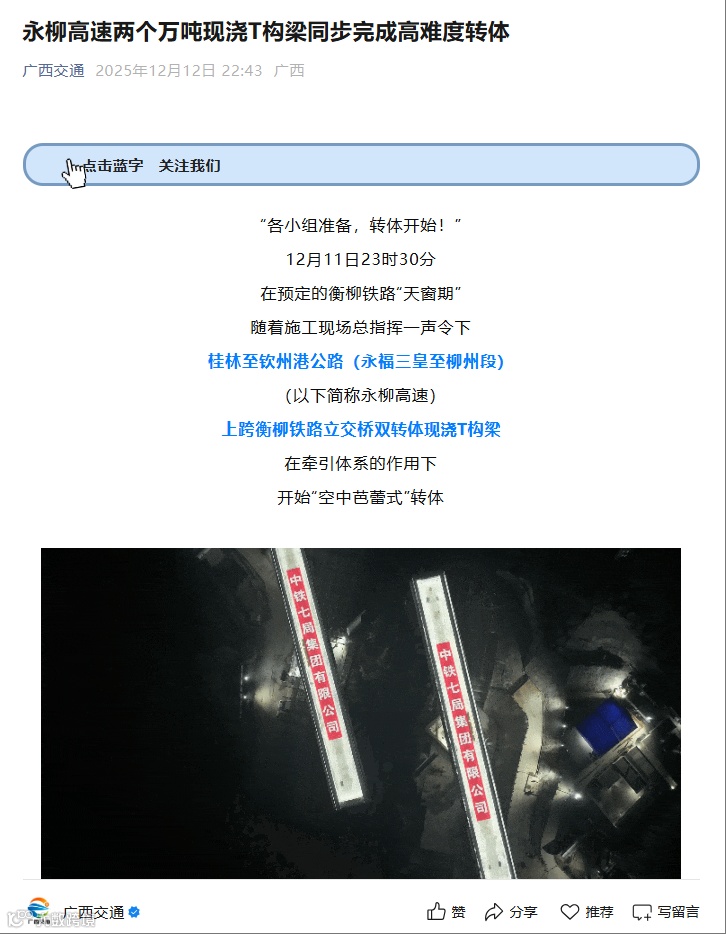 12月12日凌晨,由中铁七局承建的永柳高速跨衡柳铁路双转体现浇T构梁成功转体。连日来,人民日报、新华社、中央广电总台、中国新闻社、央视网、工人日报、人民网、中国新闻网、今日头条、广西日报、广西新闻、广西交通、广西广播电视台、柳州日报、柳州交通广播、中工网等各级媒体纷纷进行报道。