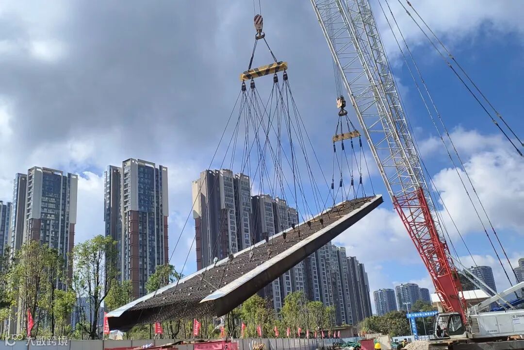 11月13日,襄宜高速公路项目飞鼓楼大桥首片长40米、重达130吨的预制T梁平稳精准地落位,标志着该大桥正式进入上部结构施工阶段。