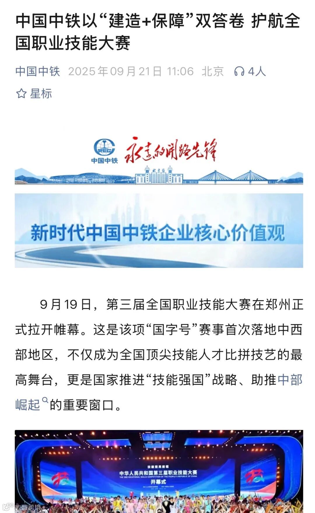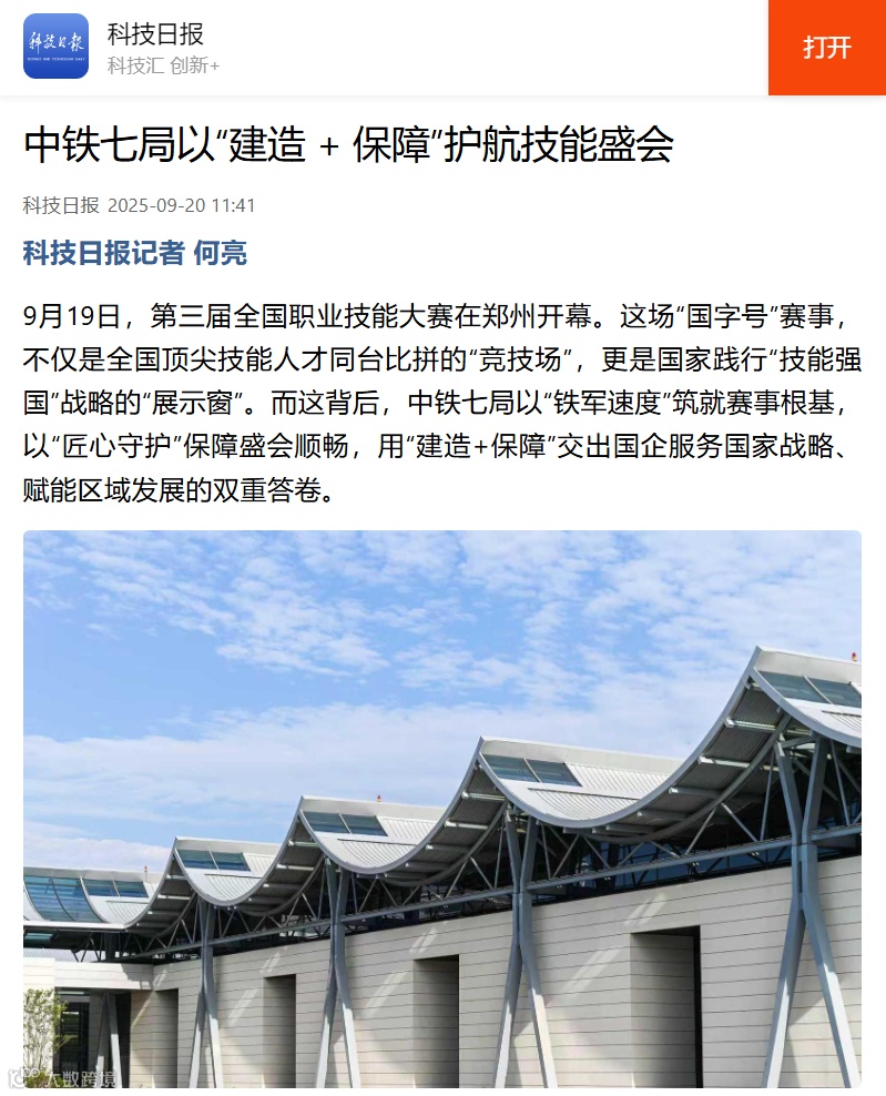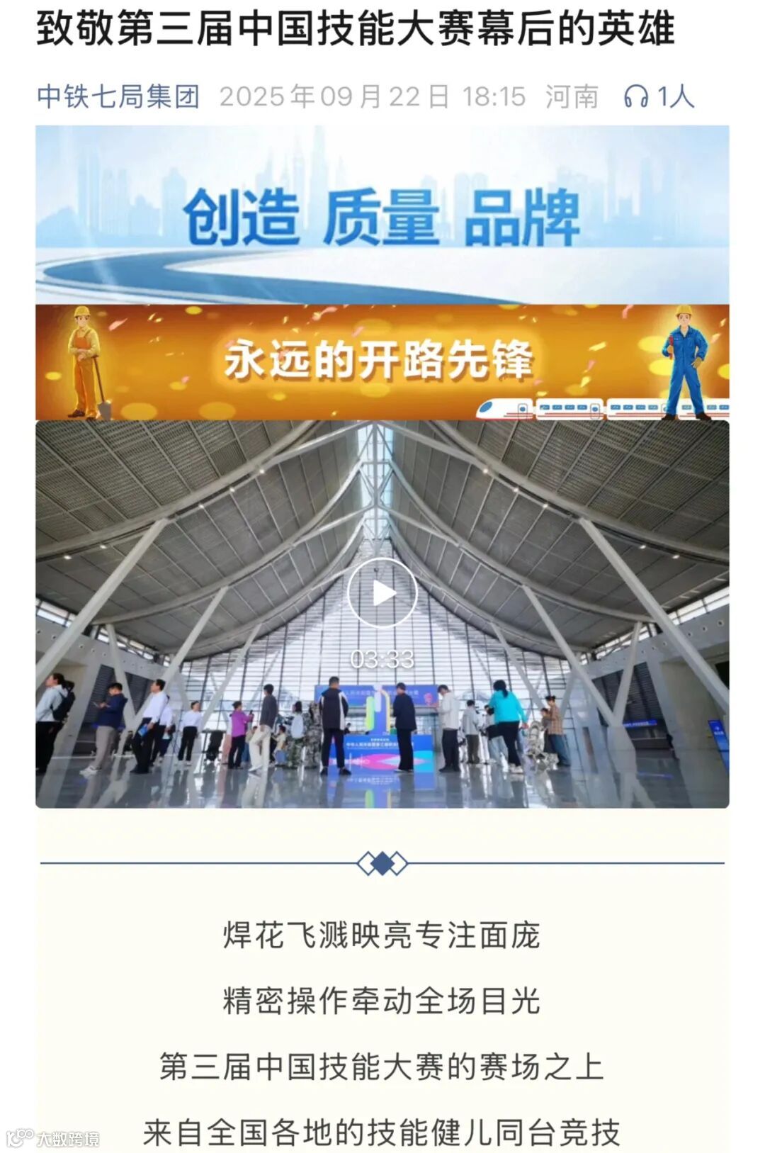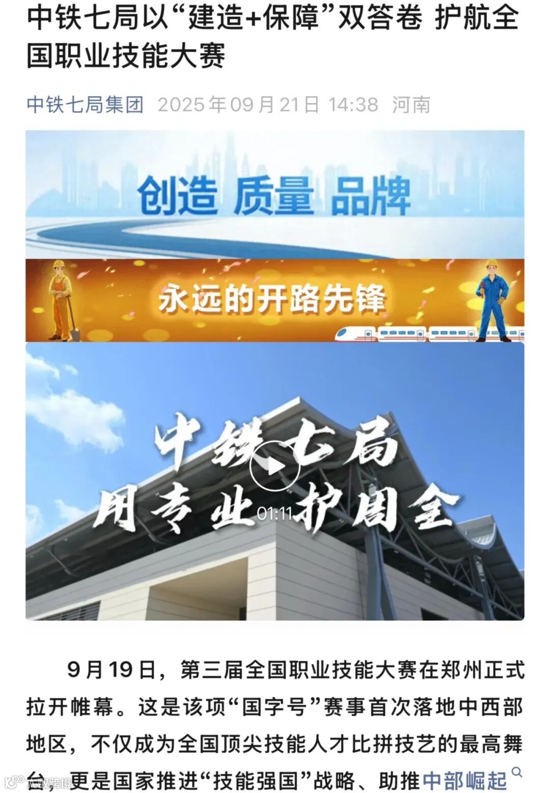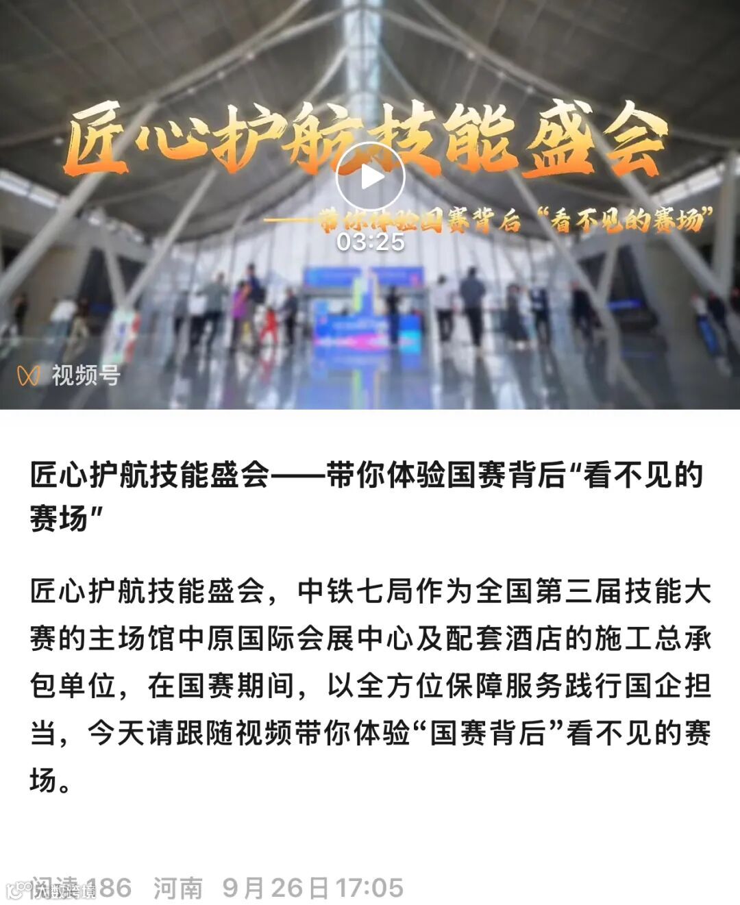 9月19日至23日,第三届全国职业技能大赛在郑州开幕。为护航此次技能盛会,中铁七局以“铁军速度”筑就国赛主场馆——中原国际会展中心及配套酒店,并保障盛会顺利进行,用“建造+保障”的双重答卷,诠释着国企服务国家战略、赋能区域发展的硬核担当。中铁七局作为国赛背后的幕后力量,得到了社会各界的一致好评,内外宣同时发力,为国赛助力的系列图文报道和短视频,频频亮相光明日报、科技日报、中国新闻社、中国中铁微公、视频号、强国号等媒体平台,起到了良好的社会效应。