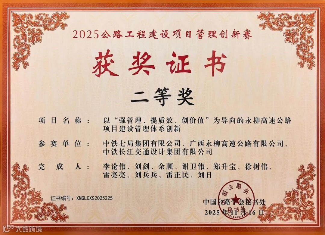 《贯穿“质量-进度-计量”核心链条的高速公路智慧建设管理平台建设及应用》案例荣获一等奖,《基于高风险点的路桥隧实体工程的安全生产管理创新》、《绿色建造引领未来,十大创新举措构建永柳高速全维度综合管理》、《以“强管理、提质效、创价值”为导向的永柳高速公路项目建设管理体系创新》3项案例荣获二等奖,《依托“工友考勤”小程序的便捷式、信息化劳务管理创新》案例荣获三等奖。据悉,一个企业最多能获得5个奖项。这些奖项的获得以及管理经验的交流推广,不仅是对中铁七局永柳高速项目团队的莫大肯定与鼓舞,更是中国公路学会、业内专家对永柳高速项目管理创新的高度认可,进一步展示了中铁七局在中国公路领域的专业实力,极大地提升了企业在高速公路行业的美誉度和影响力。