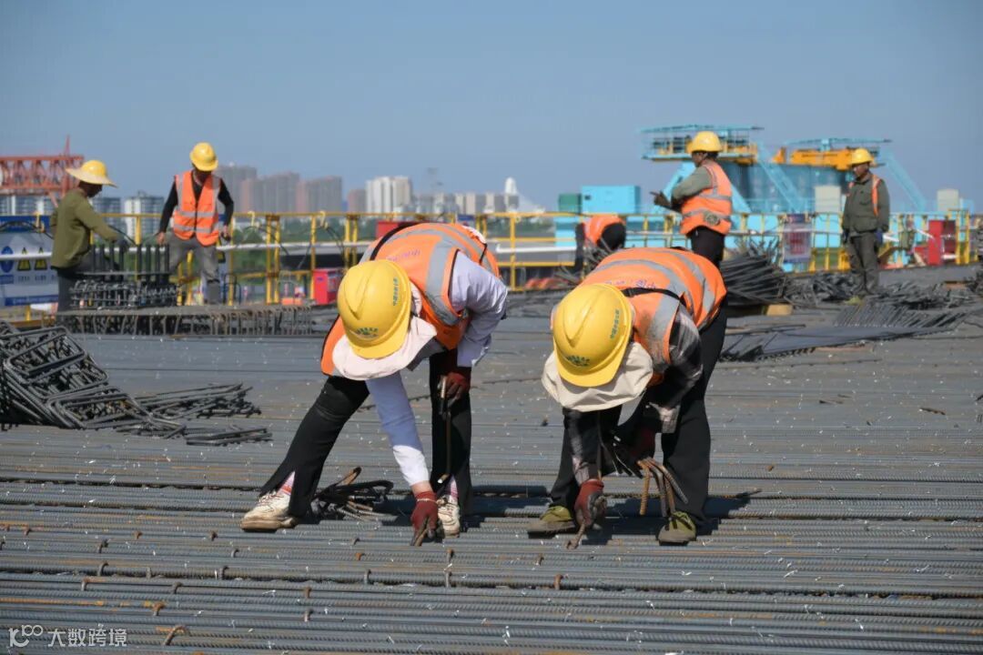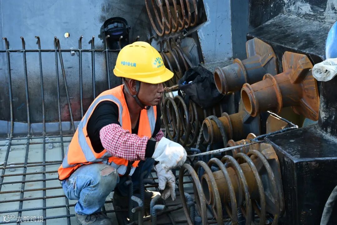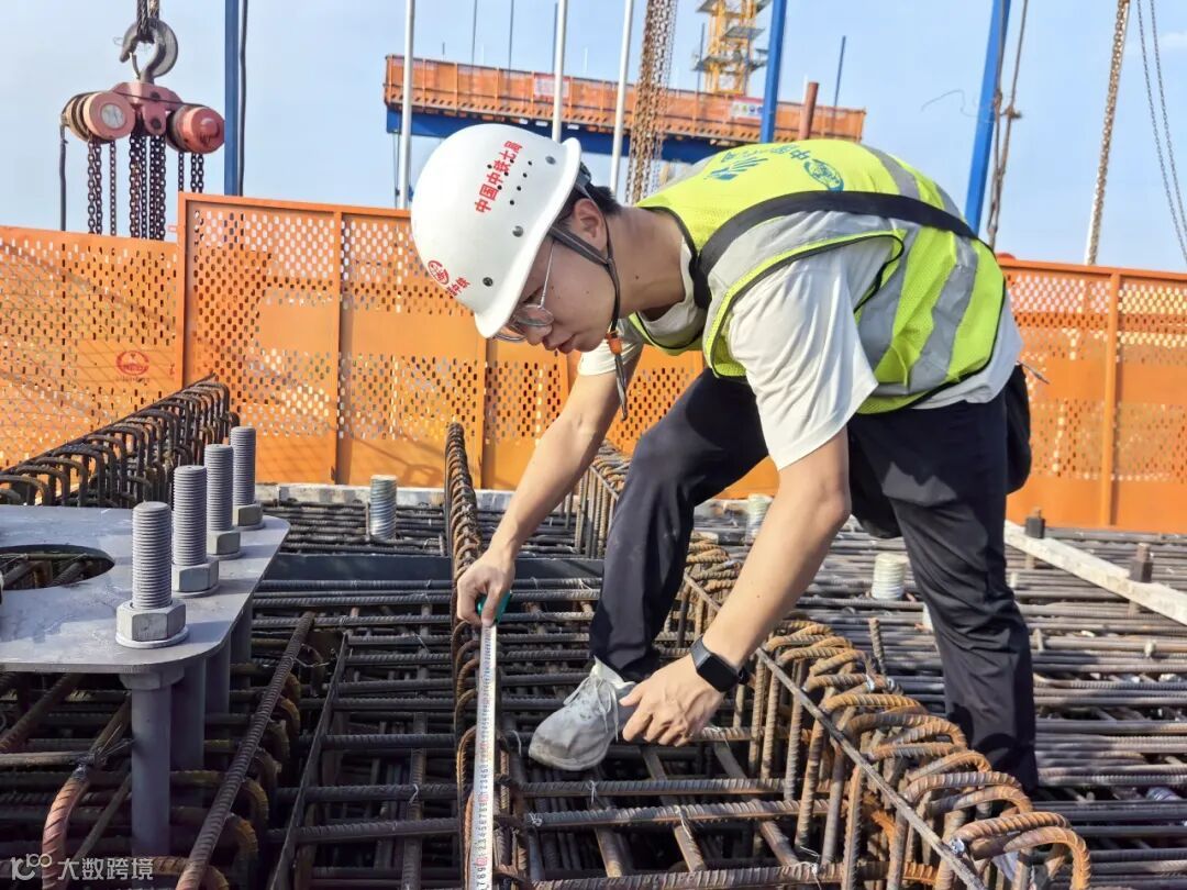 在19米高的234号墩钢筋安装平台处,钢筋工陈师傅和他的工友们正踩在炙热的钢筋架上,敏捷地在钢筋网格间移动、俯身,手中的扎钩和铁丝翻飞,精准地完成着每天近千个钢筋的绑扎任务。“咱们这环活儿一慢,后头所有工序都得等着,链条不能在我们这儿断了!”陈师傅摘下手套休息了片刻,又加入繁忙的工序中。