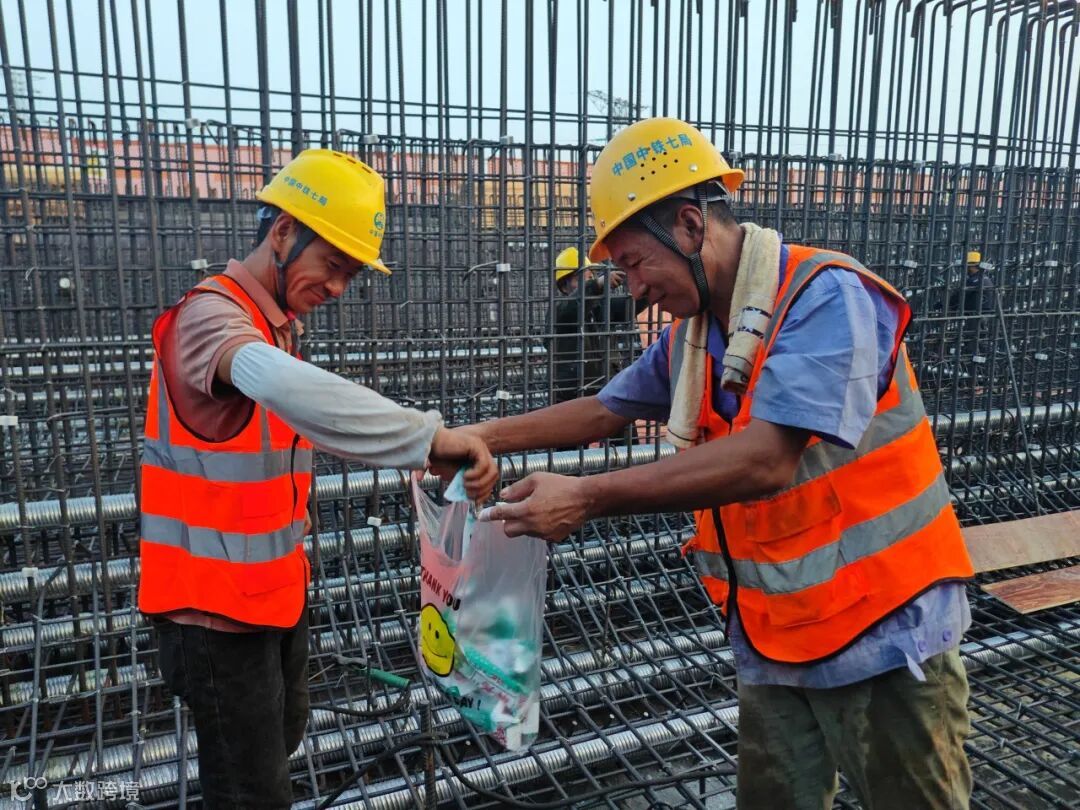 “天这么热,衣服湿透是常事,根本躲不开。”施工工人申江坤说,“我们这涉铁工程得赶进度,就是为了汛期来临时,能尽量减少对铁路的影响。所以哪怕天再热,活儿也不能松劲儿,我们都扛得住。”说着,他和工友毛勇晓正头戴防护帽,一前一后扛着建筑材料。汗水顺着两人黝黑的脸颊不住往下淌,身上的衣衫早已被汗水浸透,仿佛能拧出水来。他们时不时拿起挂在脖子上的毛巾,匆匆擦去脸上的汗珠。