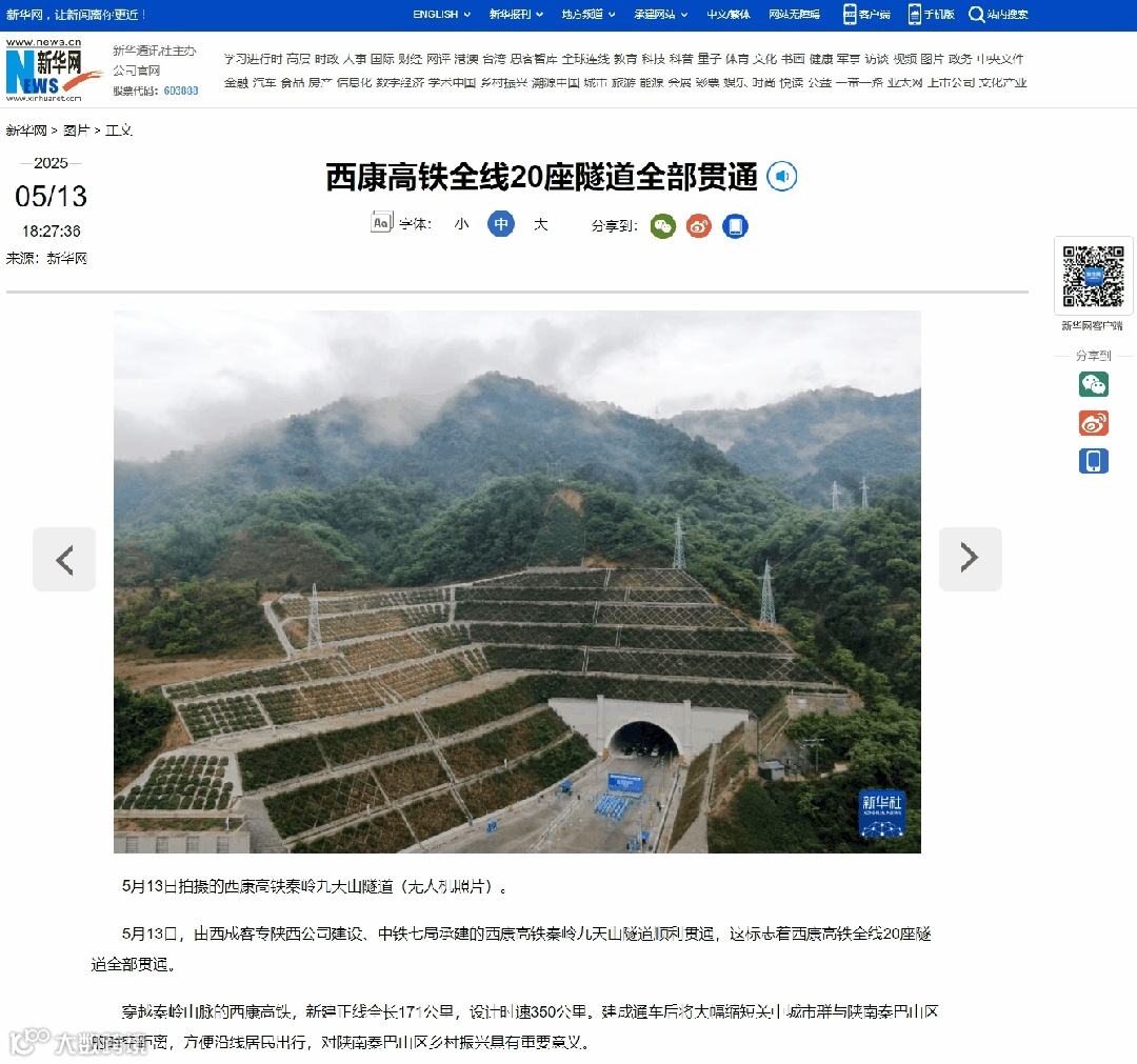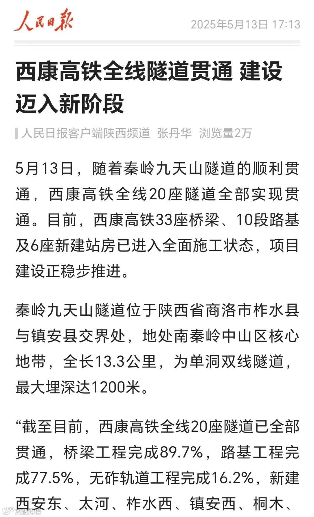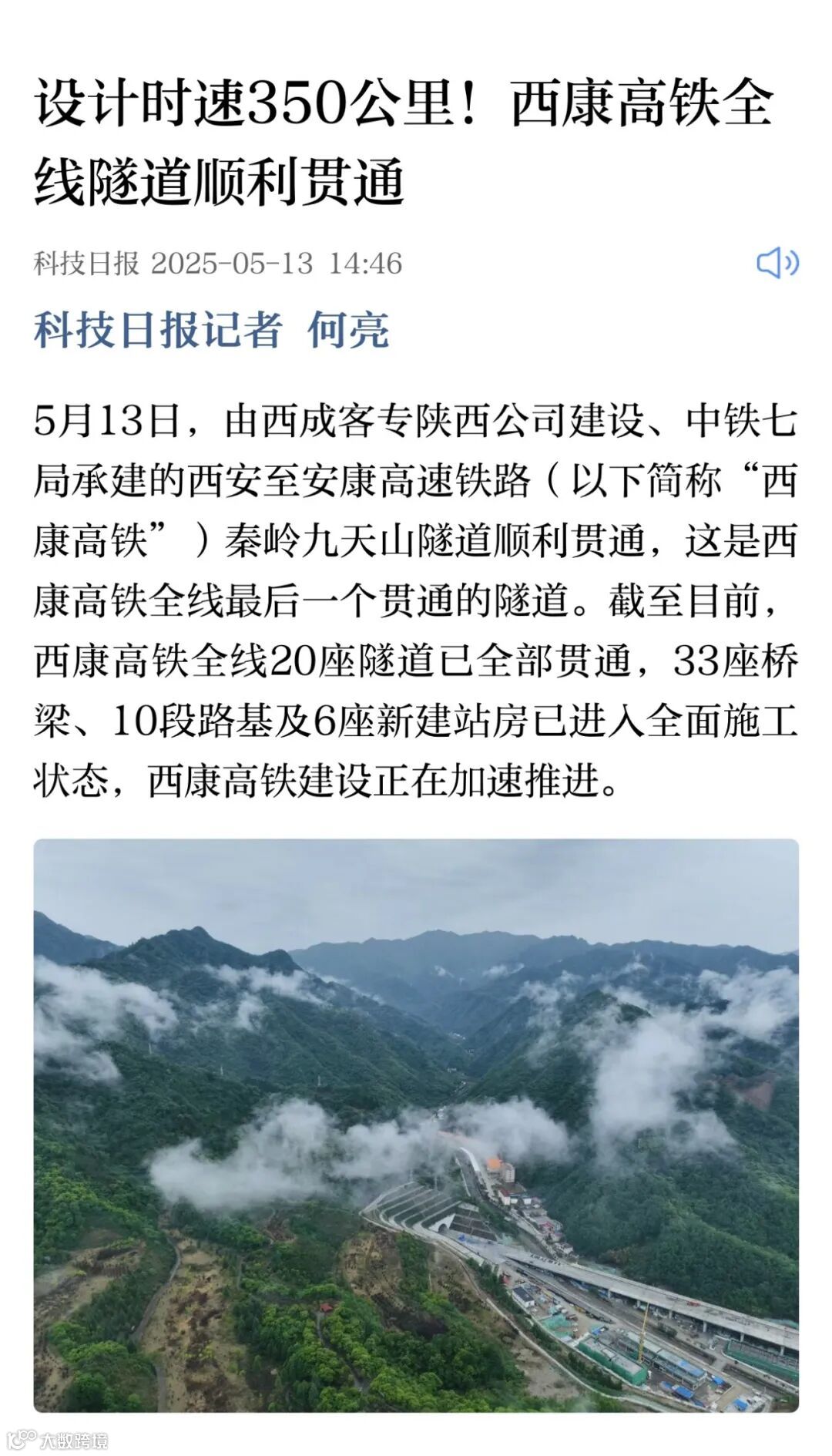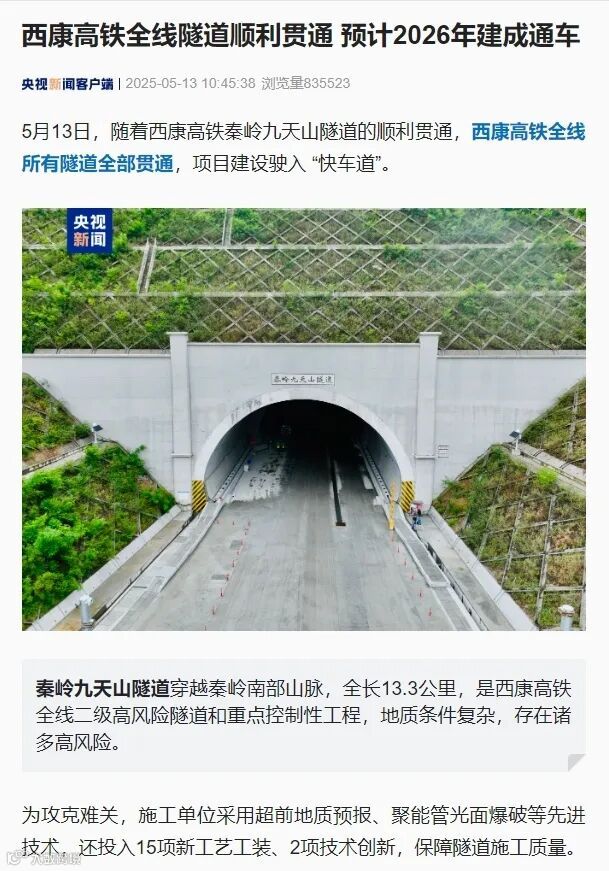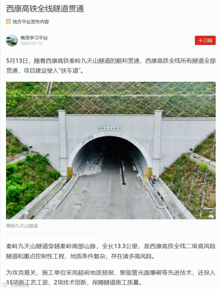 5月13日,由中铁七局承建的西康高铁秦岭九天山隧道顺利贯通,至此,西康高铁全线20座隧道全部实现贯通,项目建设驶入“快车道”。