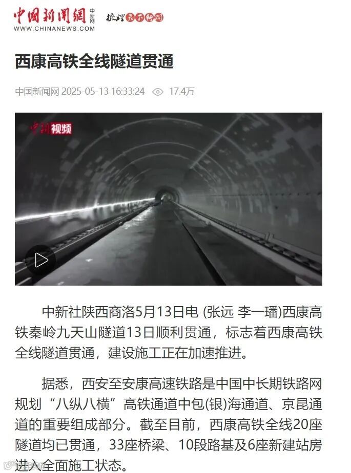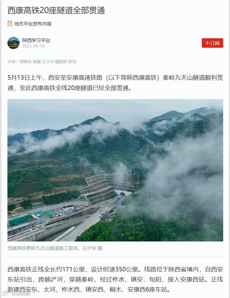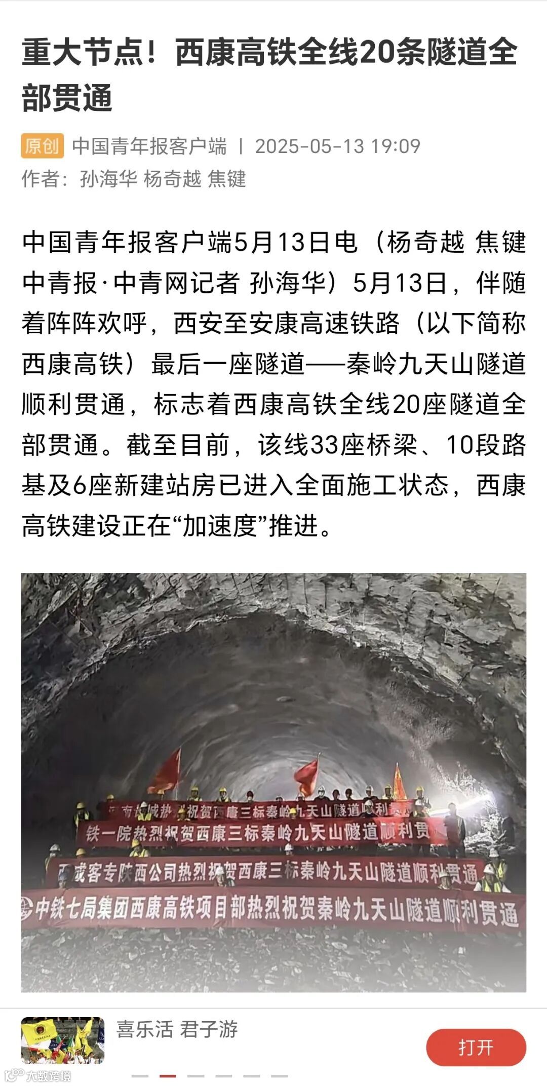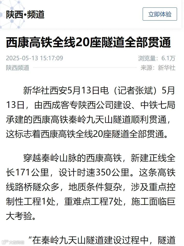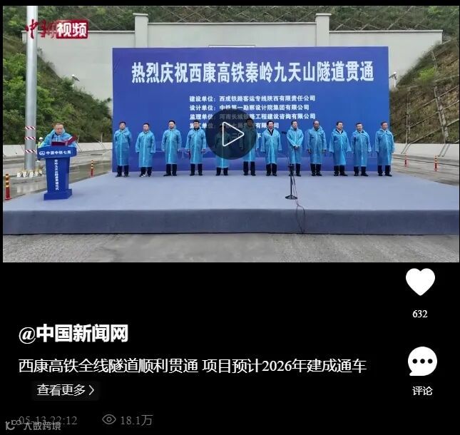 5月13日,由中铁七局承建的西康高铁秦岭九天山隧道顺利贯通,至此,西康高铁全线20座隧道全部实现贯通,项目建设驶入“快车道”。