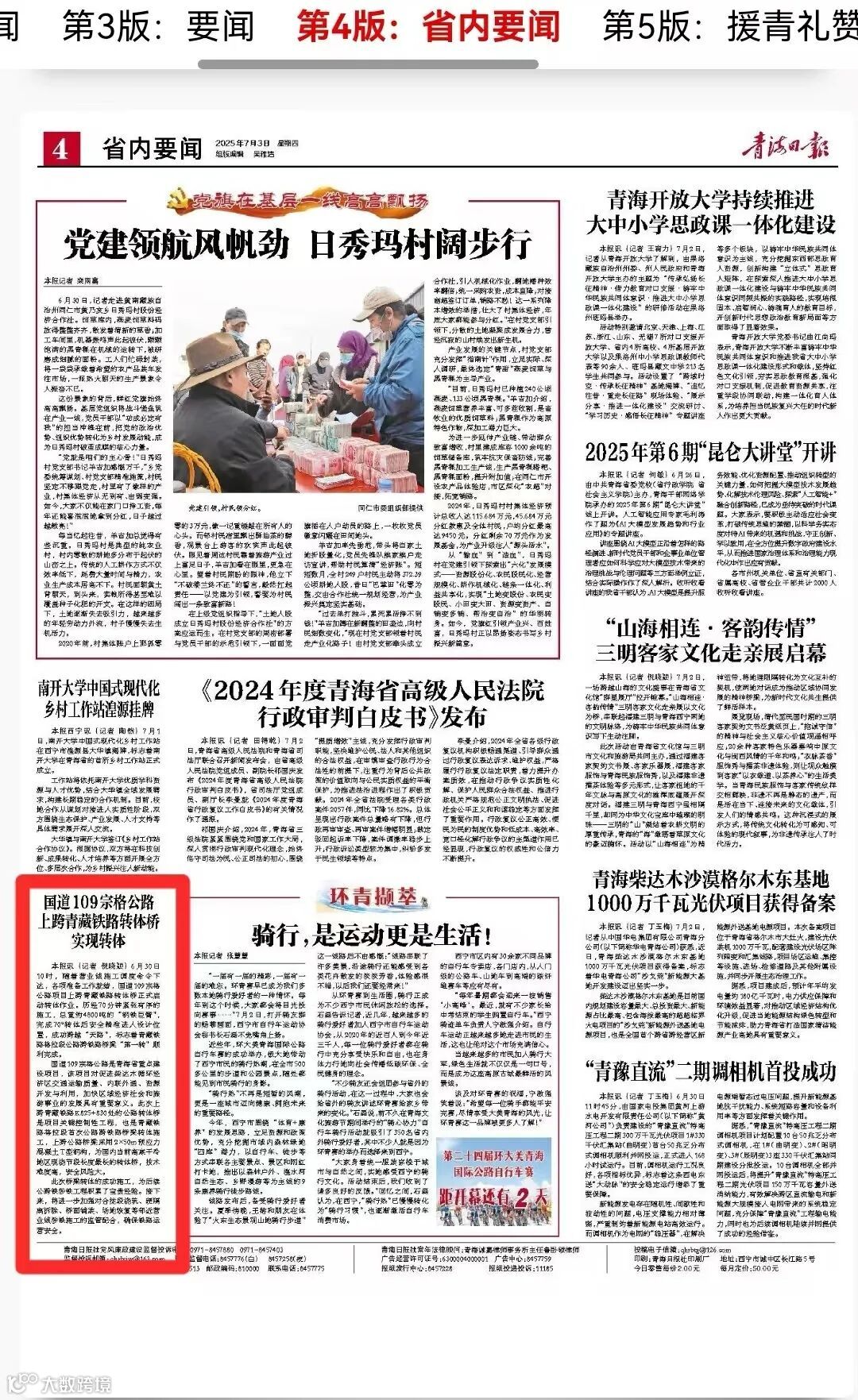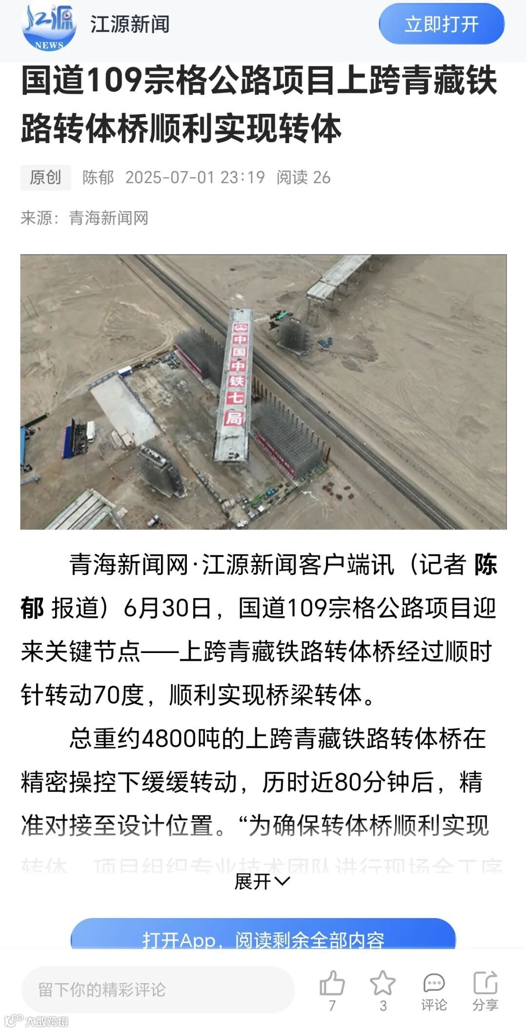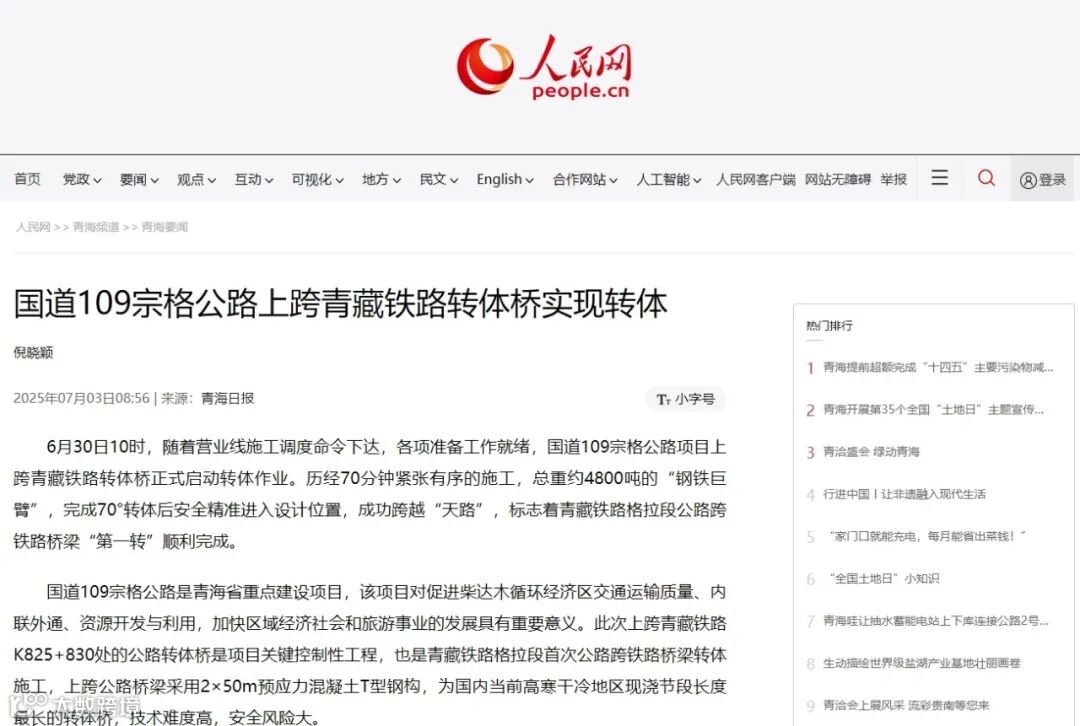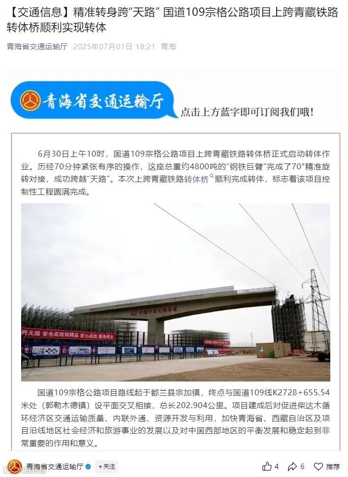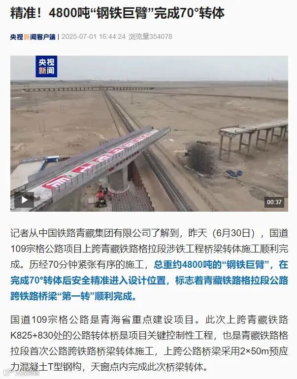 6月30日,中铁七局三公司承建的国道109宗格公路项目上跨青藏铁路格拉段涉铁工程桥梁历经70分钟紧张有序的施工,总重约4800吨的“钢铁巨臂”,在完成70°转体后安全精准进入设计位置,桥梁转体施工顺利完成。央视新闻、经济日报、学习强国、中新网、青海广播电视台、青海日报等国家级、省部级媒体进行了广泛报道。