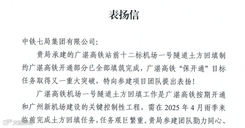 4月8日,广东广湛铁路有限责任公司、中国铁设广湛铁路工程总承包项目部发来表扬信,对中铁七局广湛十二标机场一号隧道土方回填制约广湛高铁开通部分全部填筑完成提出表扬。机场一号隧道土方回填工作是广湛高铁按期开通的关键控制性工程,任务艰巨繁重,广大参建员工科学组织、精心谋划,勠力同心,打赢了一场艰苦卓绝的攻坚战。