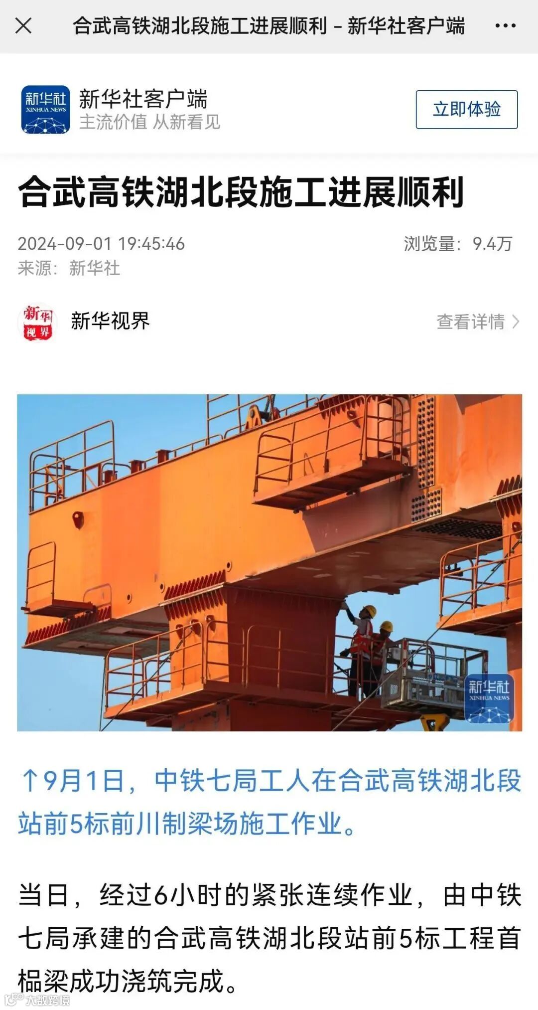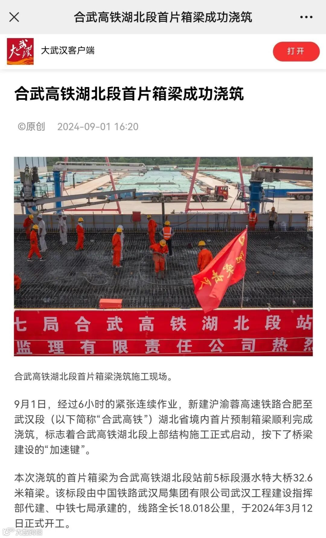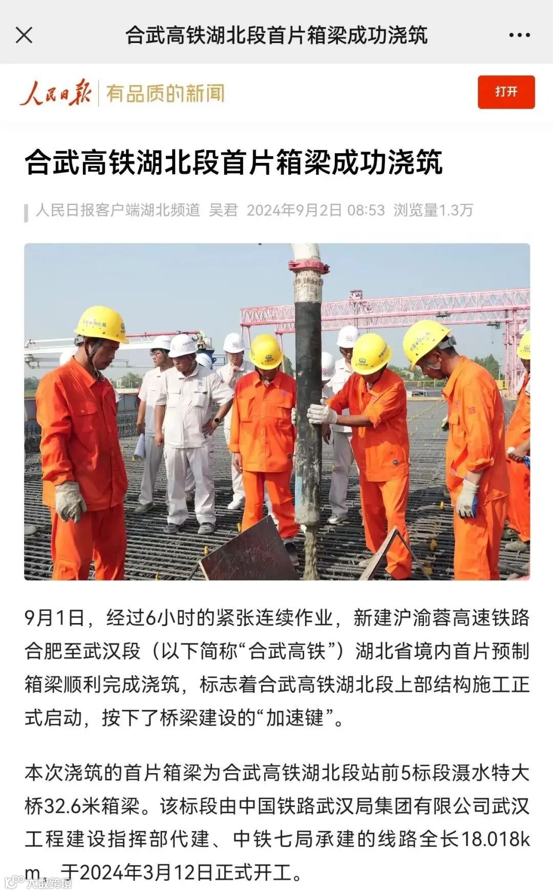 9月1日,经过6小时的紧张连续作业,由中铁七局承建的新建沪渝蓉高速铁路合肥至武汉段(以下简称“合武高铁”)湖北省境内首片预制箱梁顺利完成浇筑,标志着合武高铁湖北段上部结构施工正式启动,按下了桥梁建设的“加速键”。一时间,该消息得到包括人民日报、新华社等多家中央主流媒体在内的各类媒体的高度关注。
