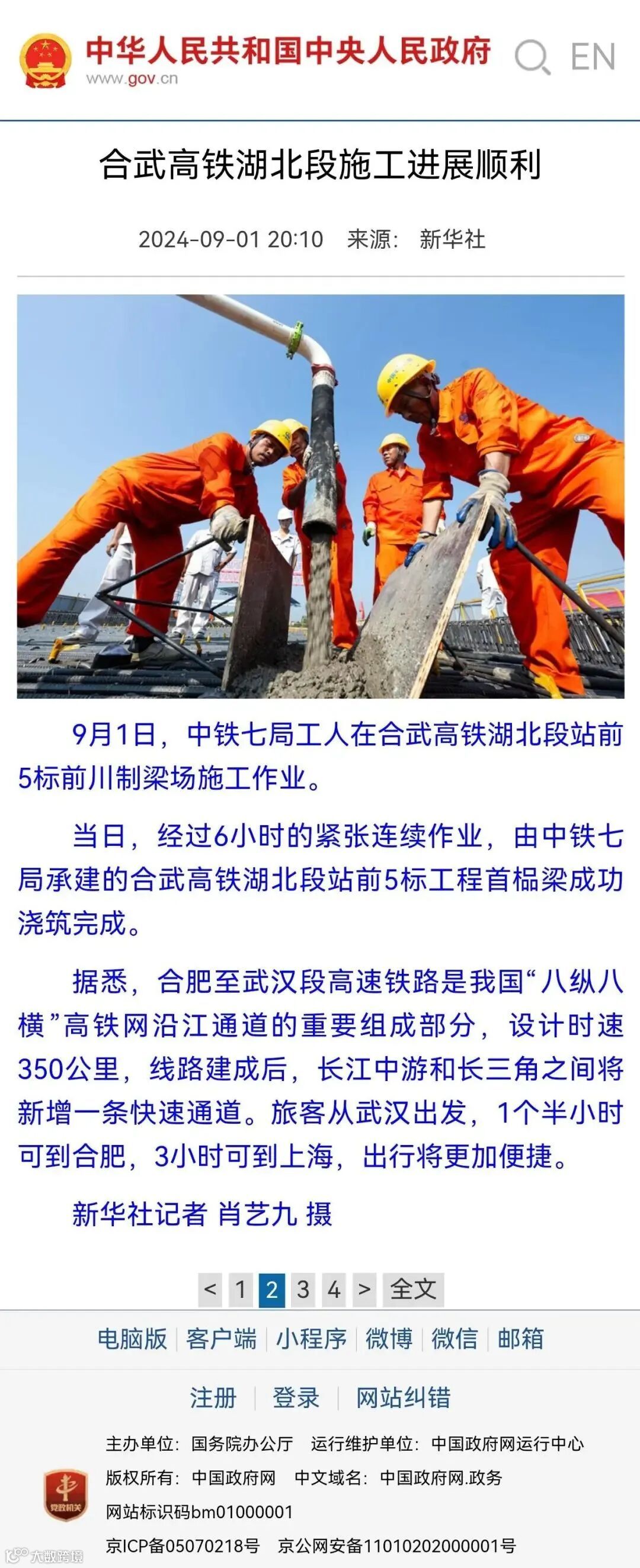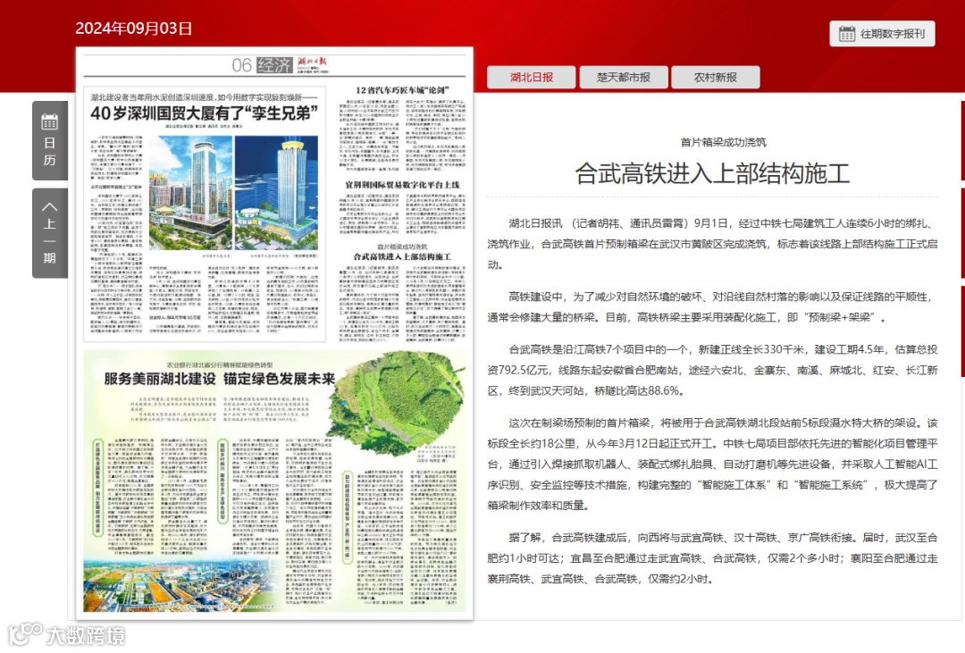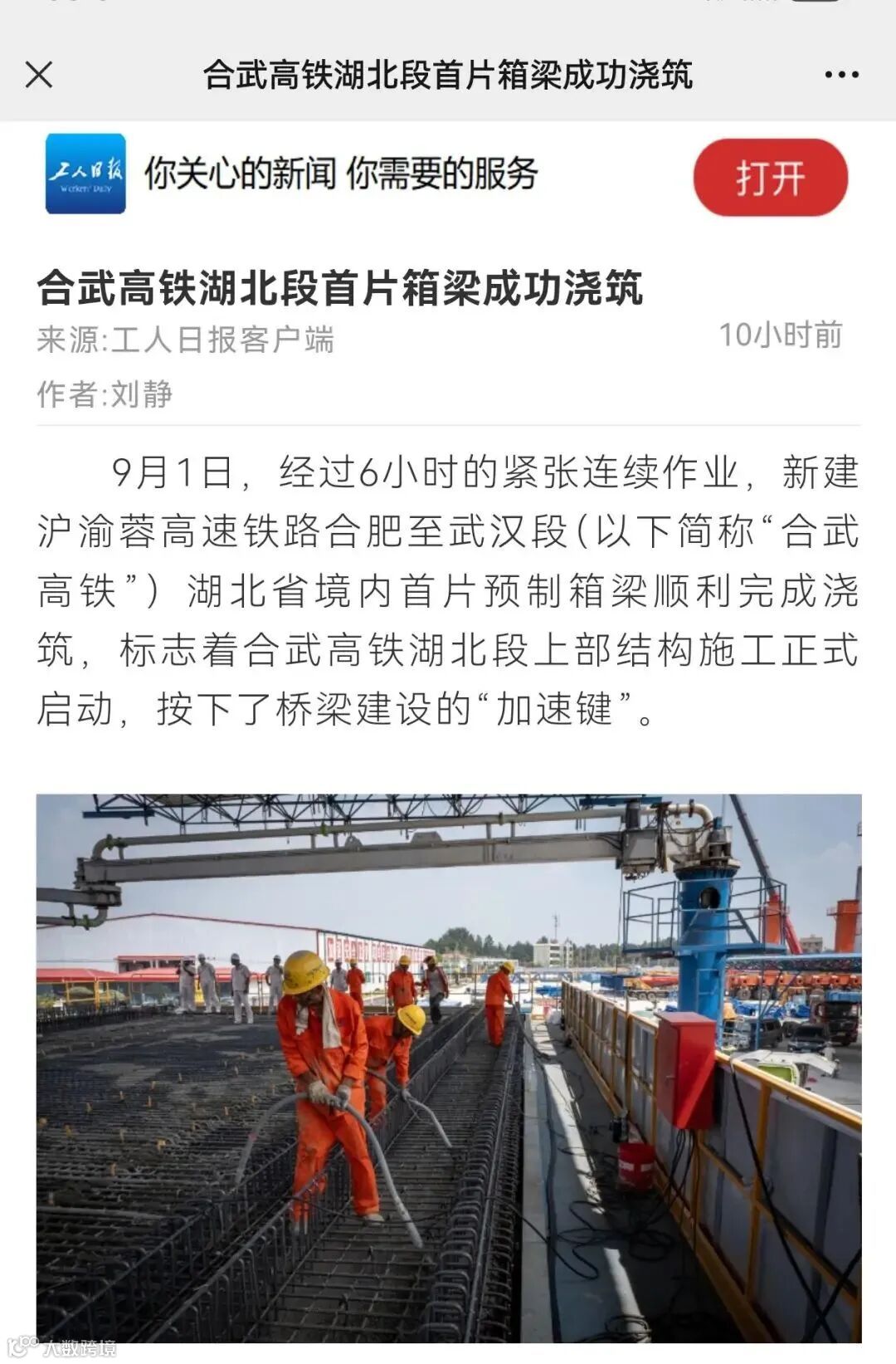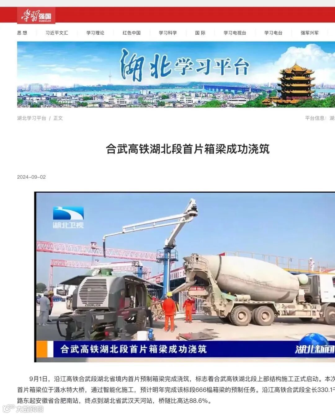 9月1日,经过6小时的紧张连续作业,由中铁七局承建的新建沪渝蓉高速铁路合肥至武汉段(以下简称“合武高铁”)湖北省境内首片预制箱梁顺利完成浇筑,标志着合武高铁湖北段上部结构施工正式启动,按下了桥梁建设的“加速键”。一时间,该消息得到包括人民日报、新华社等多家中央主流媒体在内的各类媒体的高度关注。