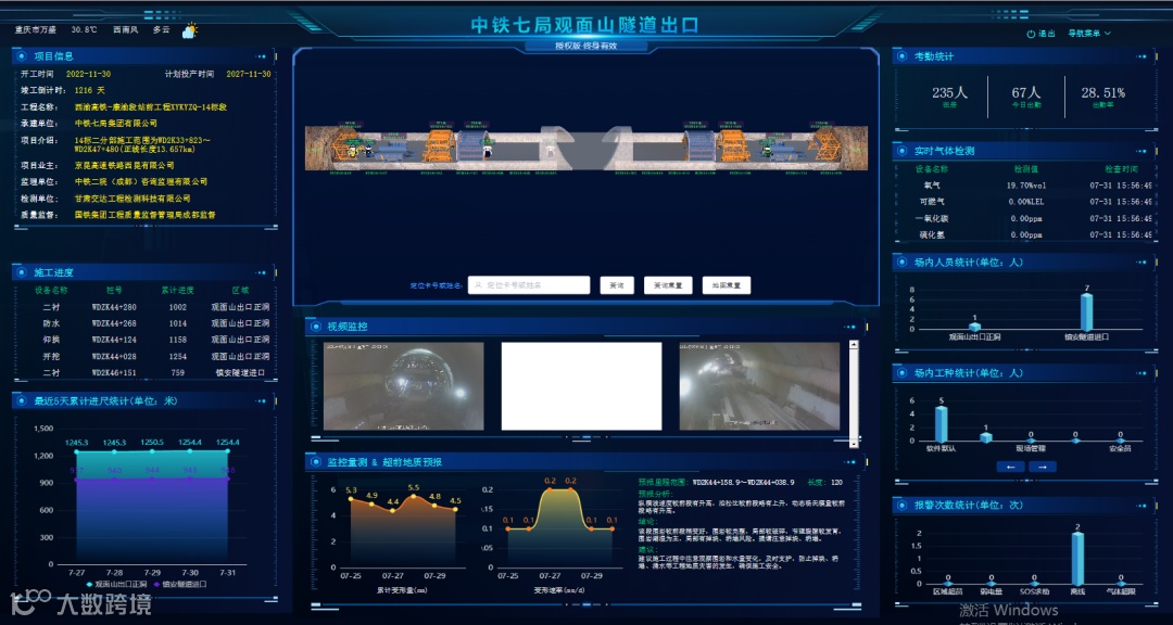 项目部将数字化智慧工地切实地运用到隧道施工和管理中去,建立了智慧工地管理中心,应用大数据综合管理平台、隧道施工安全智能监管系统、洞内安全状态信息展示系统,电子芯片定位系统等先进信息化工装设备,以信息化、动态化监管,实现了施工人员管理、智能门禁、人员定位、环境监测、物料管理、进度管理、实时监控等现代数字化管理,切实提高了施工质量、安全、进度等智能化管理水平。