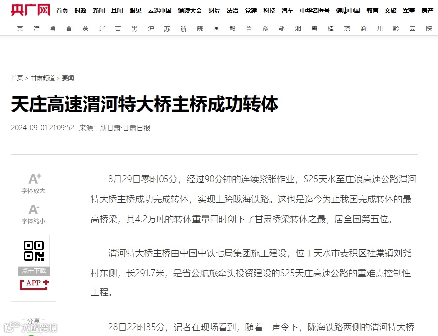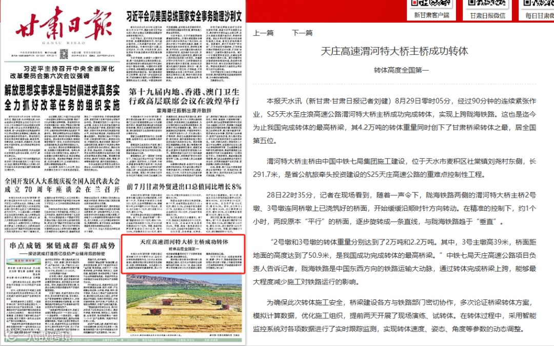 近日,中铁七局承建的静天高速公路天庄段渭河特大桥主桥完成转体,此次转体施工为国内转体高度最高、甘肃省内转体质量最大。大桥施工情况获得了中央电视台、甘肃日报、甘肃卫视、甘肃广电总台等中央级、省部级媒体的集中报道关注,同时也获得了兰州日报、天水日报、新华网、央广网、新甘肃客户端等地方媒体和主流网站、新媒体平台的广泛转发。