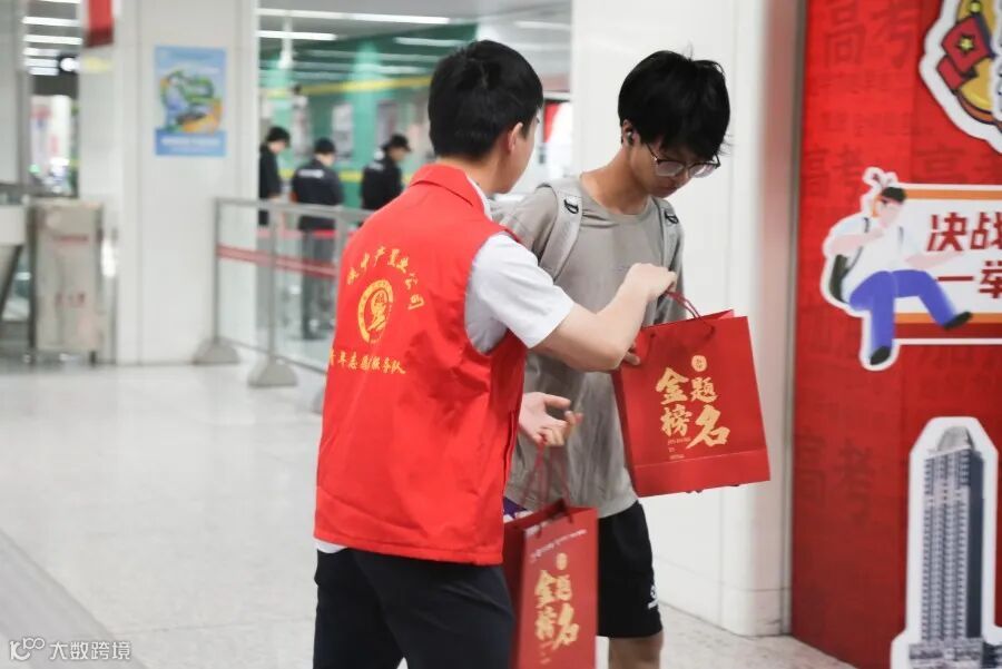 中产置业公司青年志愿者在郑州地铁1号线火车站为考生免费发放“爱心助考大礼包”,内含矿泉水、锦鲤手绳、小福果香包、扇子等物品,助力莘莘学子圆梦高考。