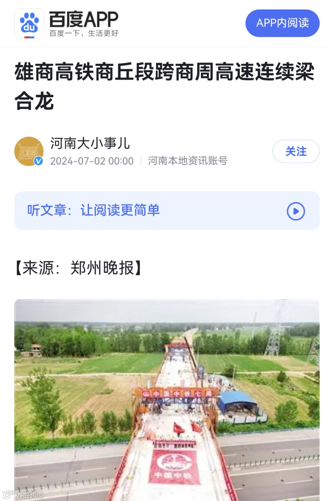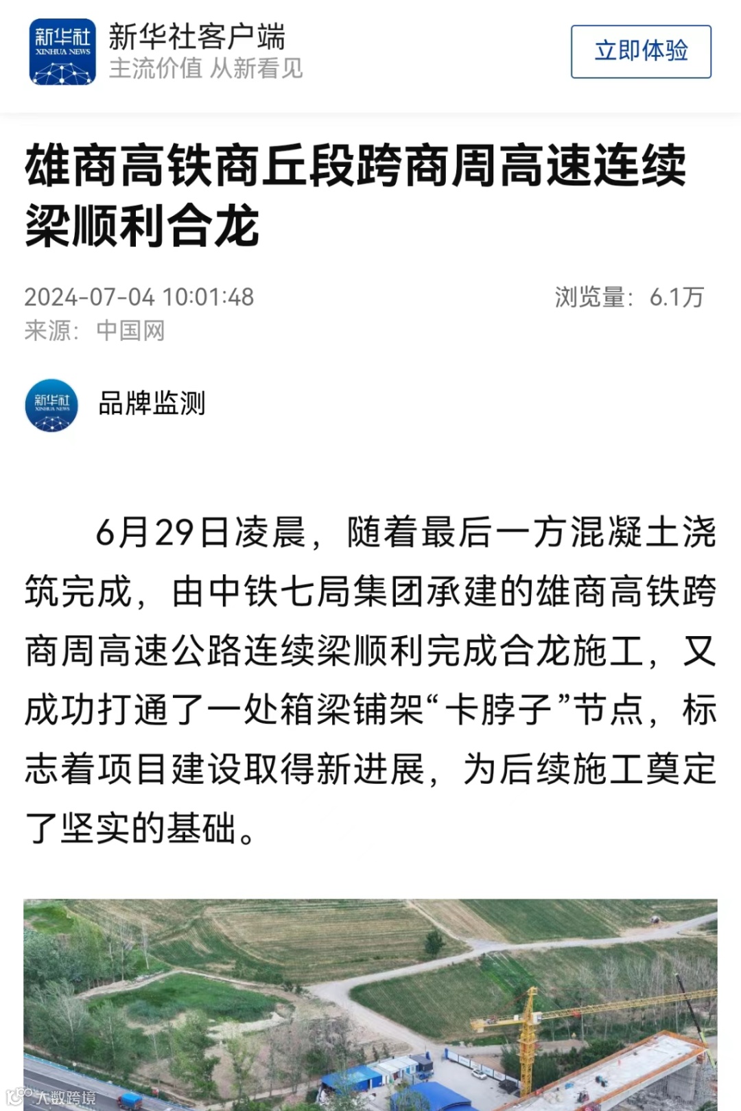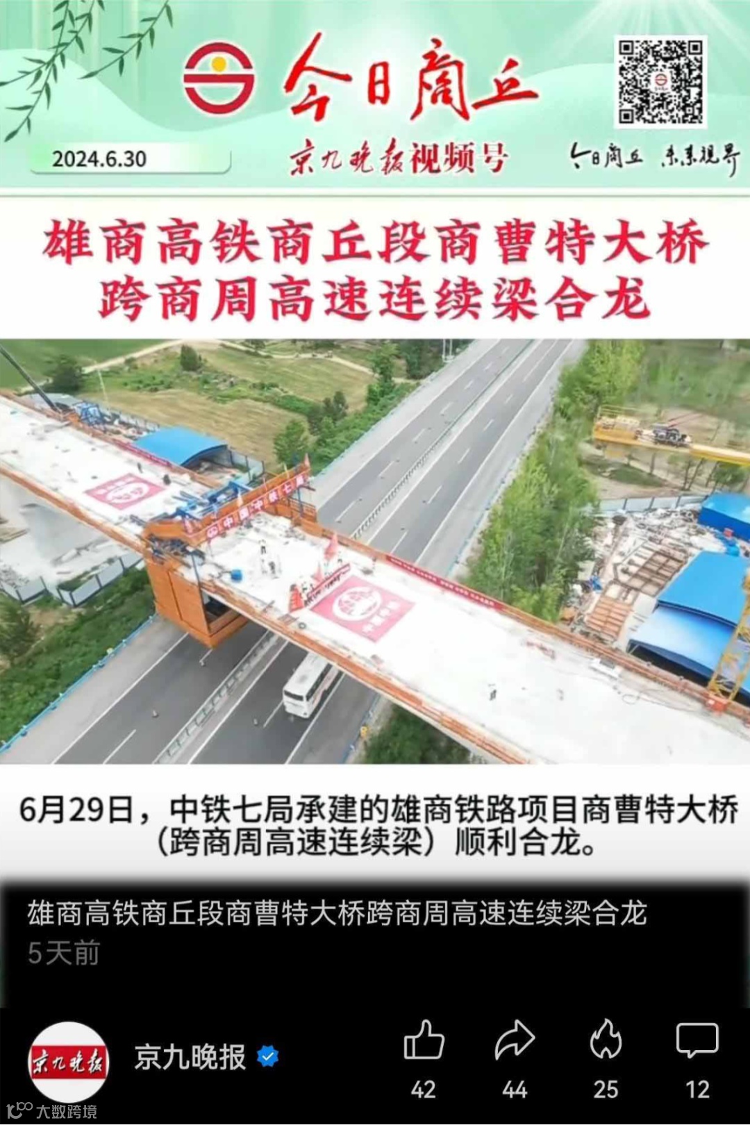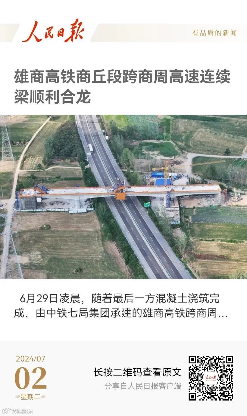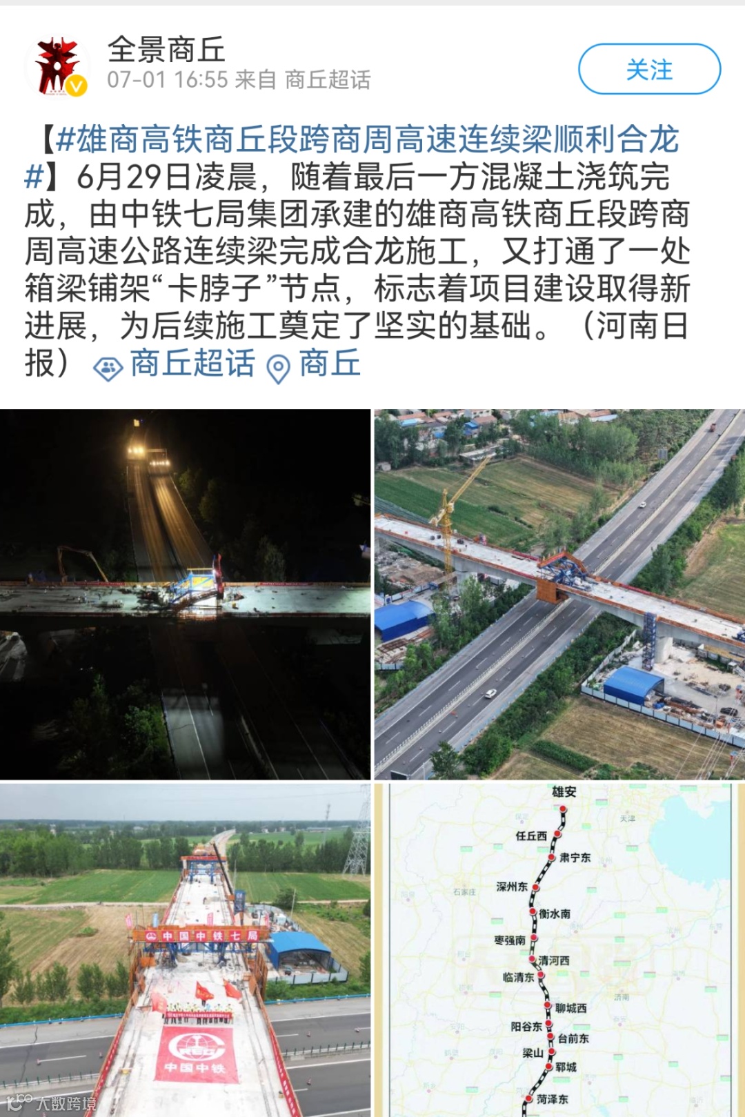 6月29日凌晨,随着最后一方混凝土浇筑完成,由中铁七局承建的雄商高铁跨商周高速公路连续梁顺利合龙,标志着项目建设取得新进展,为后续施工奠定了坚实的基础。