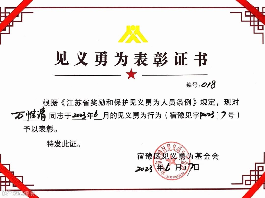 为他颁发了“见义勇为”表彰证书