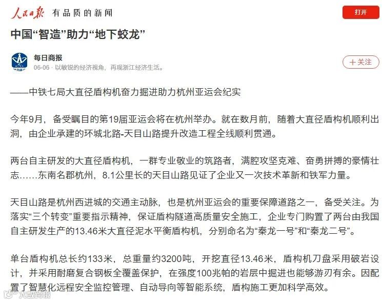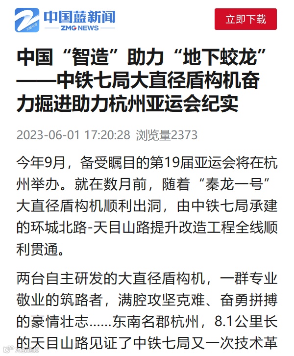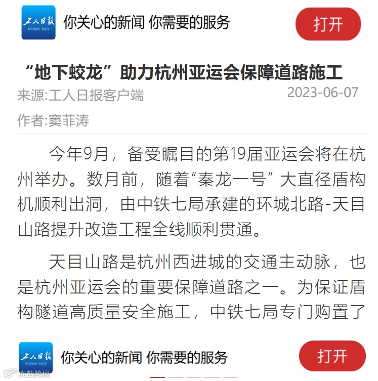 今年9月,备受瞩目的第19届亚运会将在杭州举办,作为杭州西进城交通主动脉和杭州亚运会重要保障道路之一,中铁七局承建的环城北路-天目山路提升改造工程的顺利贯通和建设历程获得了人民日报、新华社、工人日报、学习强国、中国日报等国家级重量媒体的集中报道关注,中国蓝新闻、陕西广电等地方媒体也争相报道了该项目建设情况。