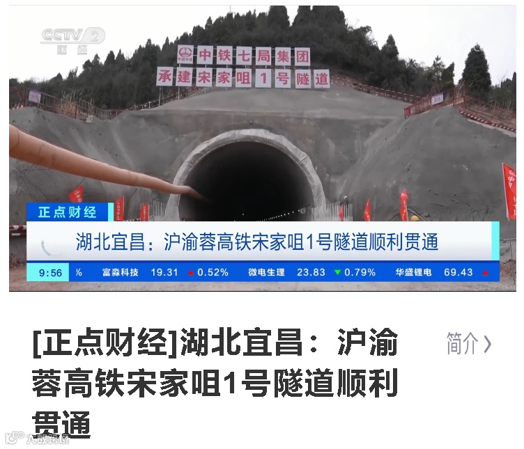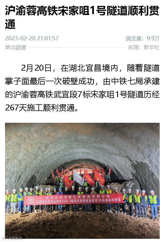 2月20日,由中铁七局集团承建的新建沪渝蓉高铁武宜段7标宋家咀1号隧道顺利贯通。CCTV13、CCTV2、新华社、中新社、经济日报、湖北卫视、湖北日报等主流媒体相继展开报道。