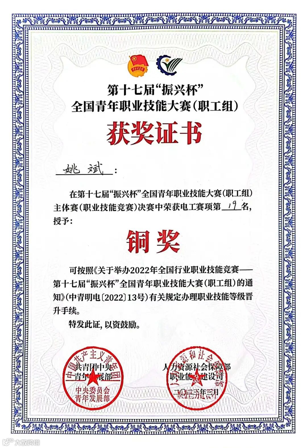 姚斌,男,汉族,1992年8月出生,中共党员,高级技师,本科学历,现任中铁七局西安公司水电分公司作业队长。在此次第十七届“振兴杯“全国青年职业技能大赛(职工组)主体赛(职业技能竞赛)决赛中荣获电工赛项第19名,授予铜奖。该同志曾荣获“中铁七局岗位能手标兵”“中铁七局金牌职工”“中国中铁技术标兵”“中国中铁青年岗位技术标兵”“中国中铁劳动模范”“全国青年岗位能手”“陕西省技术能手”“河南省五一劳动奖章”“陕西省劳动模范”等荣誉。