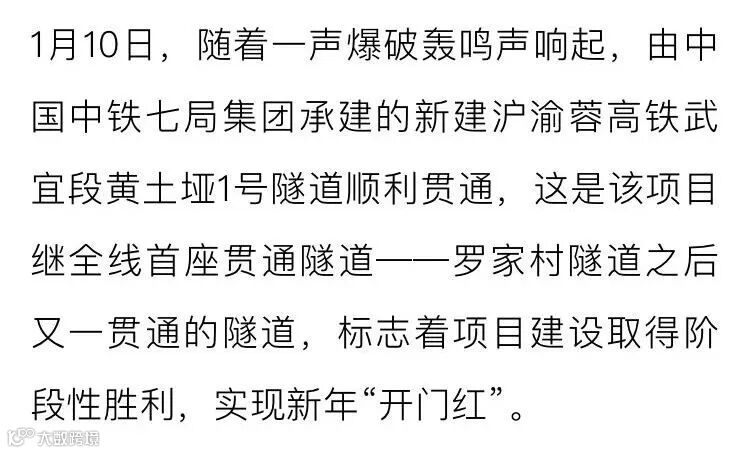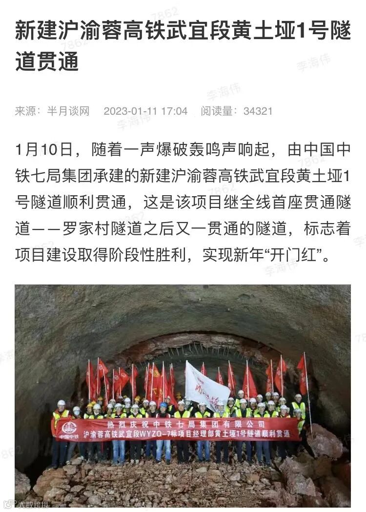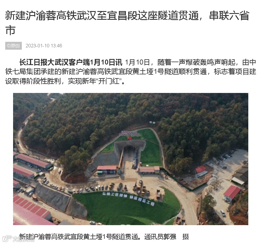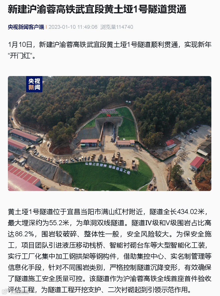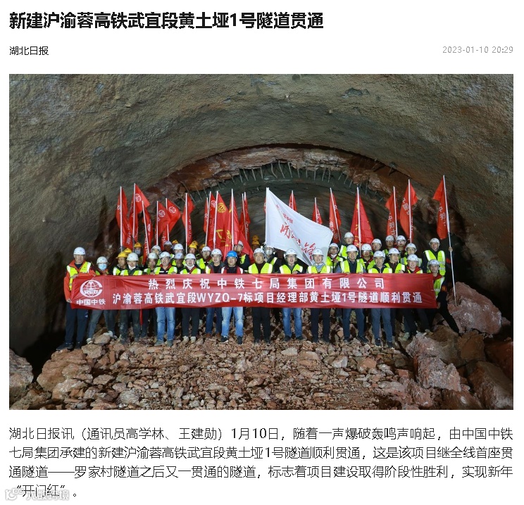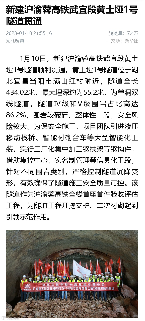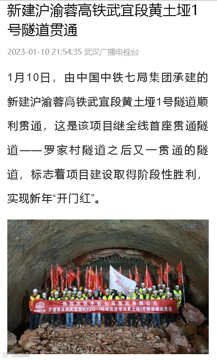 1月10日,由中铁七局集团承建的新建沪渝蓉高铁武宜段黄土垭1号隧道顺利贯通。央视新闻、新华社、中新社、半月谈、湖北广播电视台、湖北日报、武汉广播电视台、长江日报等媒体高度关注,相继对黄土垭1号隧道的顺利贯通进行了报道。