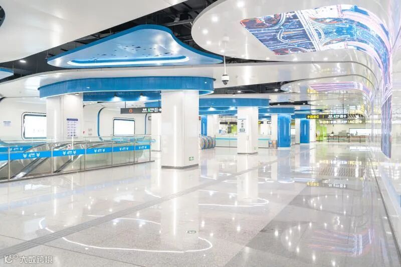 郑州地铁4号线七里河站(航海东路站)主题设计元素选取郑州发展与路网发展,选用“折叠城市”的超前视觉效果进行展示。路网延伸处是交通的广度延伸,发达的科技带给市民从距离、通讯广度的延伸,最终呈现“万里”之遥咫尺即达。