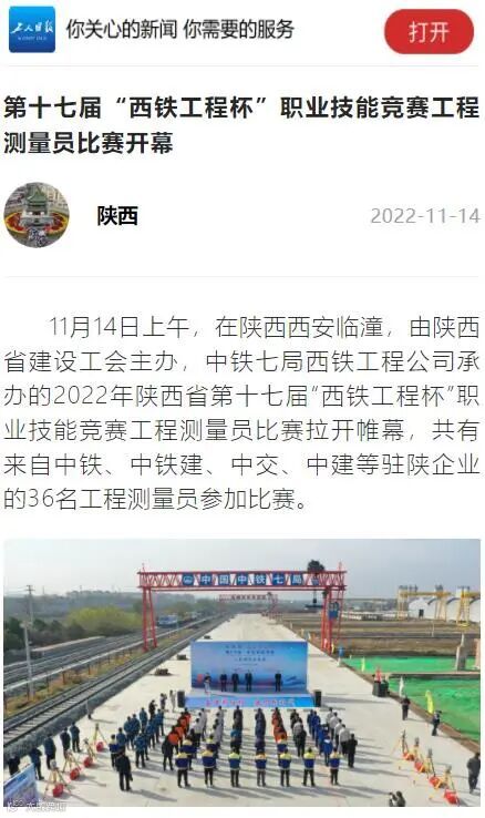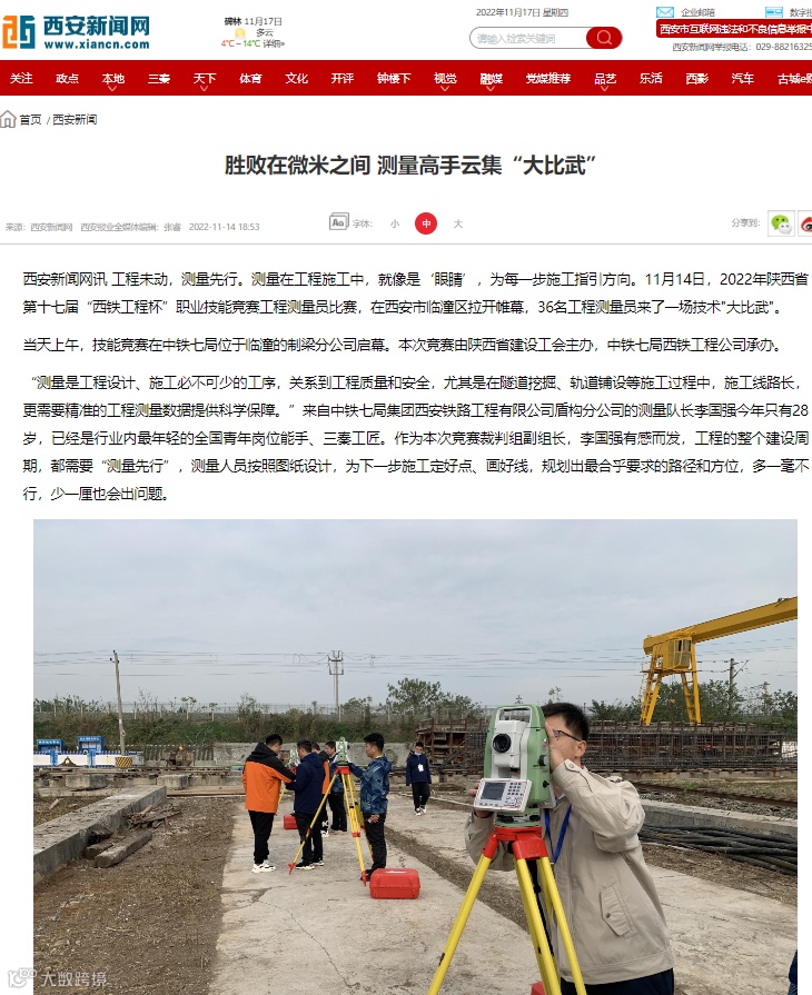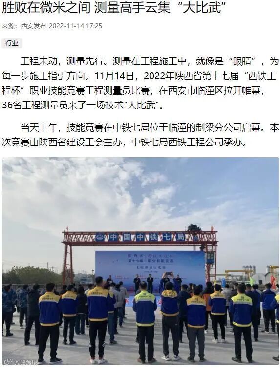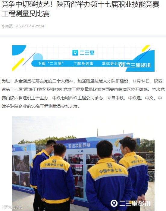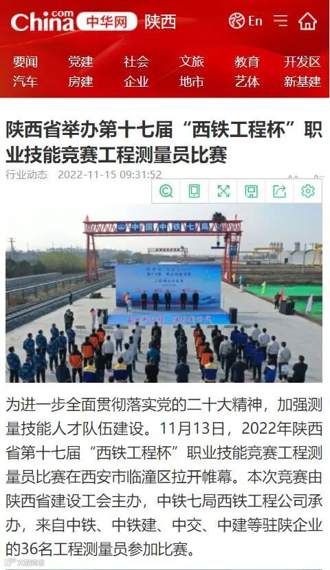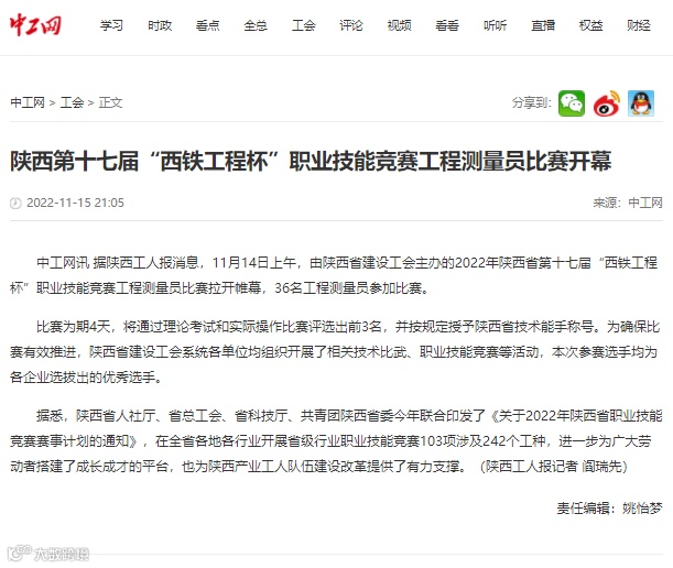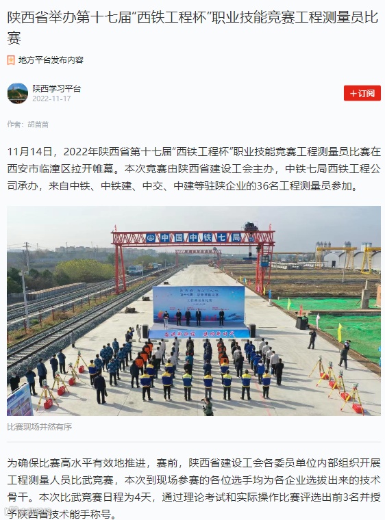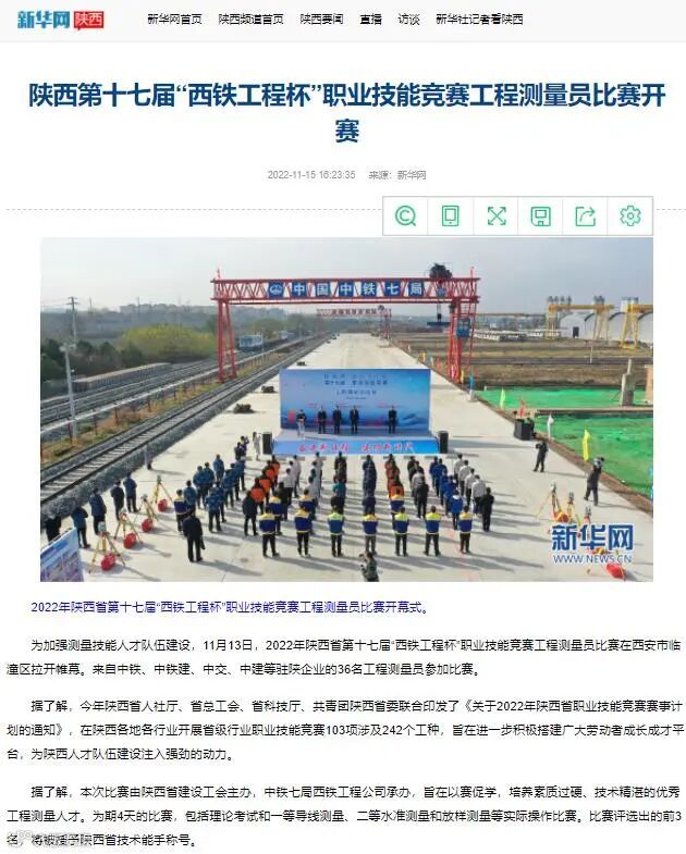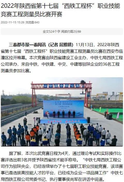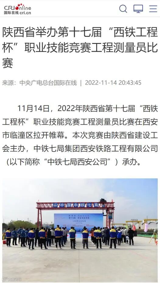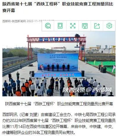 11月14日-17日 ,中铁七局西安公司成功承办了2022年陕西省第十七届“西铁工程杯”职业技能竞赛工程测量员比赛,受到了中央广电总台、工人日报、新华网、中华网、学习强国、陕西电视台、陕西日报、陕西工人报、华商报、三秦都市报、西部网、华商网、西安日报等多家媒体的报道,其中,陕西电视台新闻中心在开幕式现场利用微博、抖音、快手、起点新闻客户端进行了现场直播,观看人数达到15万人次,起到了良好的宣传效果。