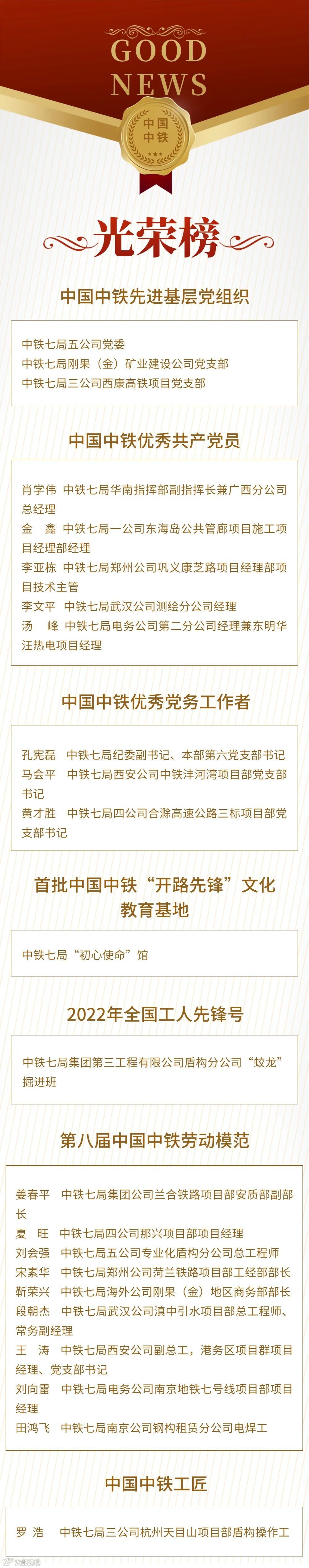 6月27日上午,中国中铁党委召开庆“七一”表彰大会暨党建思想政治工作会议,宣读了《关于表彰先进基层党组织、优秀共产党员和优秀党务工作者的决定》、《关于命名首批“开路先锋”文化教育基地的决定》、《关于表彰中国中铁2022年全国五一劳动奖和全国工人先锋号的决定》和《关于表彰第八届中国中铁劳动模范和中国中铁工匠、优秀农民工的决定》,表彰了全国五一劳动奖、中国中铁“两优一先”、中国中铁劳模等先进。快跟随小编来看看七局哪些先进集体和个人在榜吧!