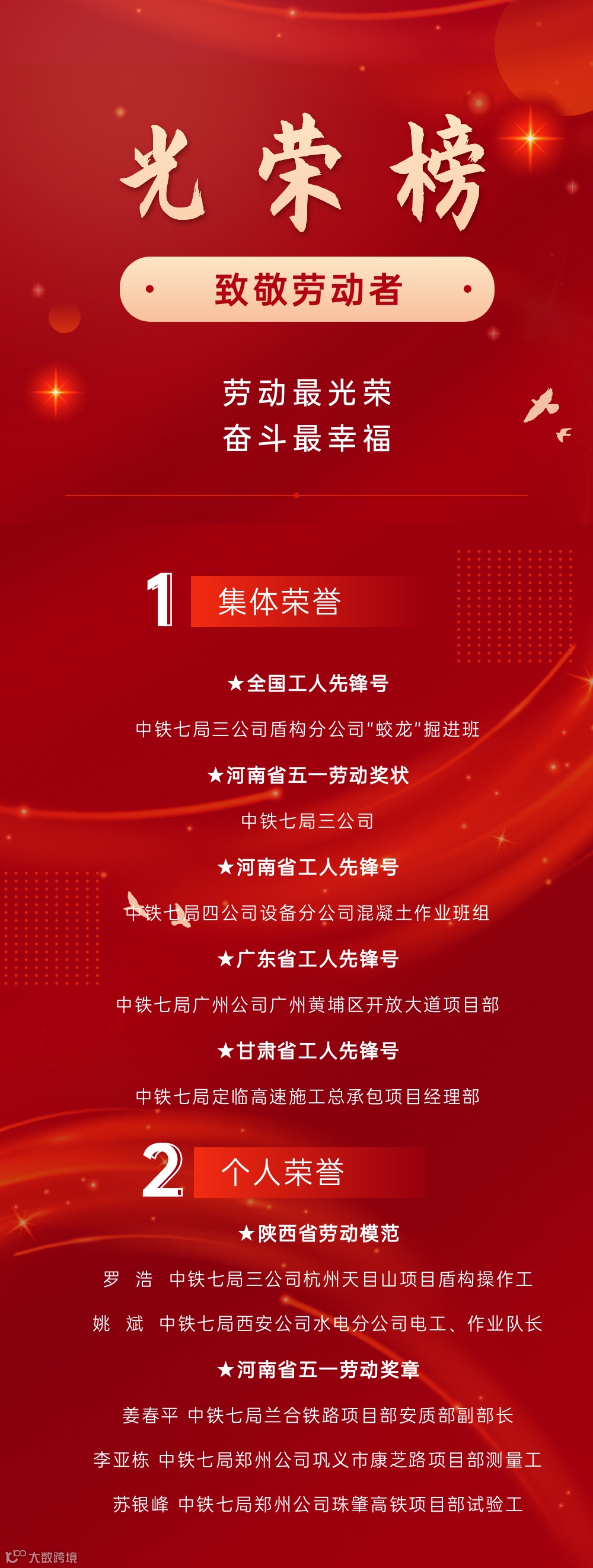 中铁七局三公司盾构分公司“蛟龙”掘进班荣获“全国工人先锋号”荣誉称号。