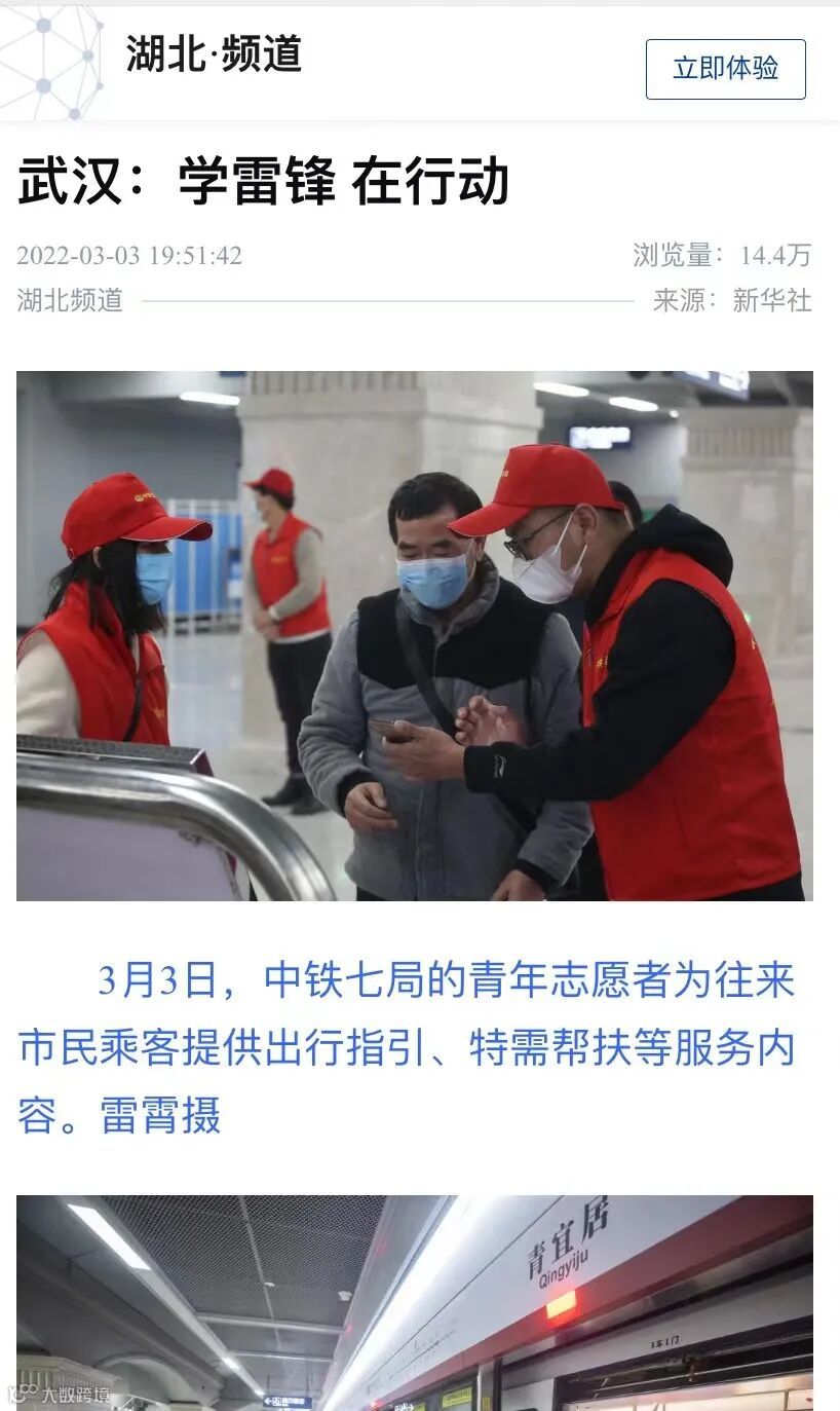 3月3日,武汉地铁5号线青宜居地铁站,来自中铁七局的10余名青年志愿者身穿红色志愿者马甲,为往来市民乘客提供出行指引、特需帮扶等服务内容。中铁七局武汉公司“幸福之家”青年志愿者服务队联合武汉地铁运营公司团委开展“‘不忘初心、牢记使命’重回武汉地铁建设故地学雷锋”志愿服务活动,以实际行动践行雷锋精神。