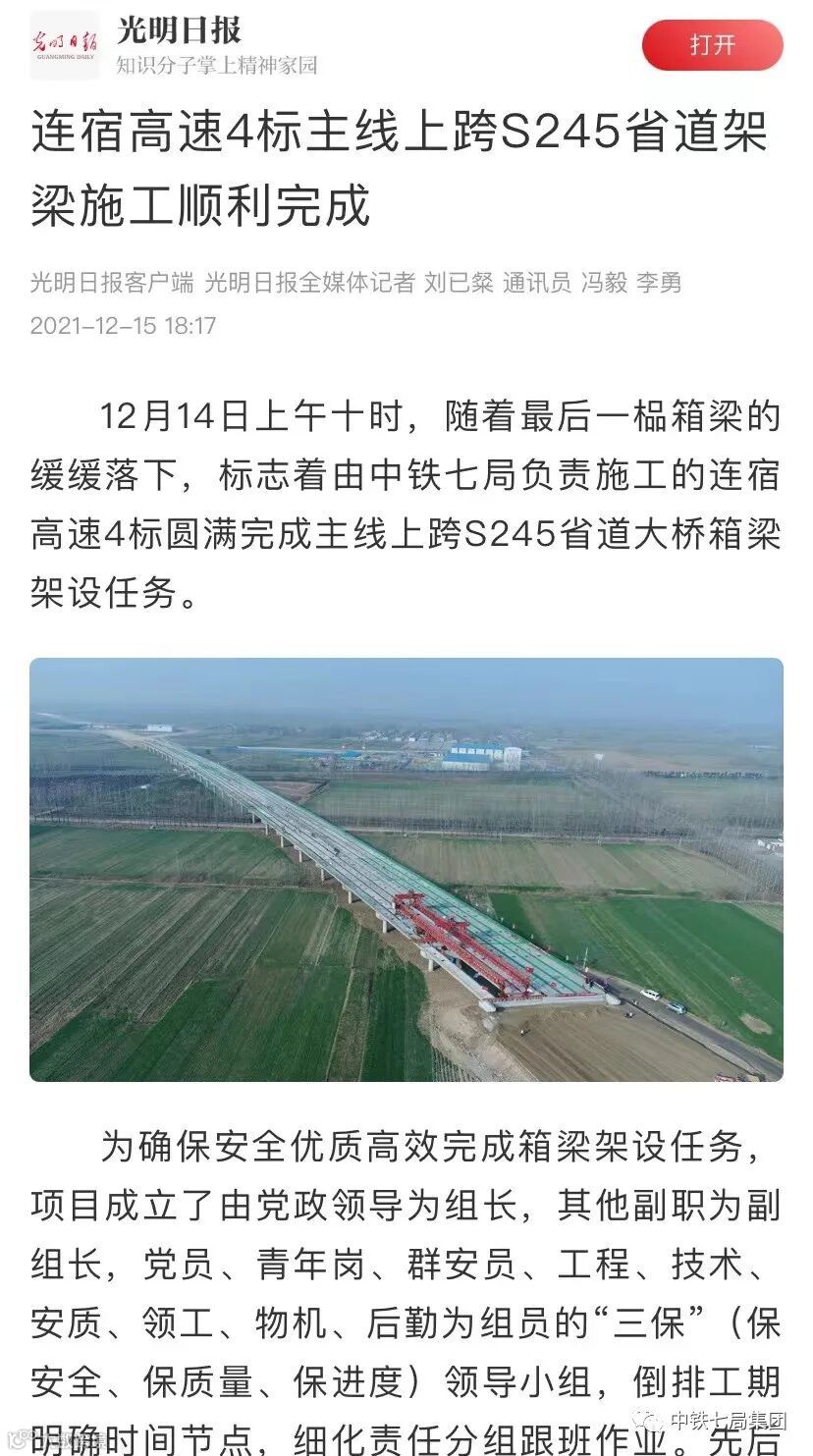 12月14日上午10时,随着最后一榀箱梁的缓缓落下,标志着由中铁七局负责施工的连宿高速4标圆满完成主线上跨S245省道大桥箱梁架设任务。