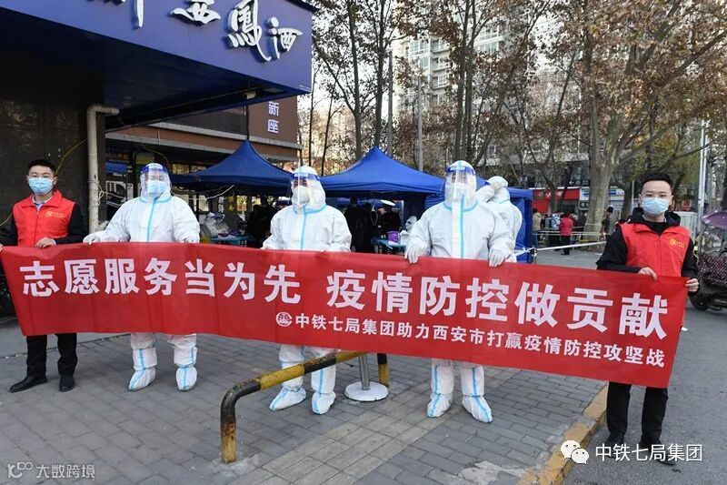 中铁七局西安公司组织青年志愿者在西安市新城区胡家庙街道万年路口核酸检测点开展志愿服务,为居民解答疑问,引导人员有序排队做核酸。