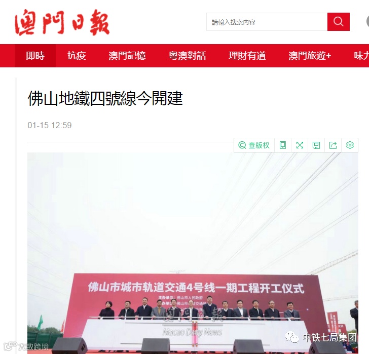 1月15日,广东省佛山市轨道交通4号线一期工程开工仪式在中铁七局承建的绿岛湖北站举行,标志着佛山地铁4号线正式开工建设。