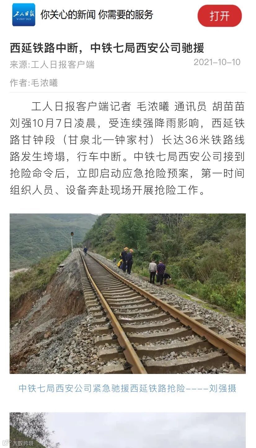 10月7日凌晨,受连续强降雨影响,西延铁路甘钟段(甘泉北—钟家村)长达36米铁路线路发生垮塌,行车中断。中铁七局西安公司接到抢险命令后,立即启动应急抢险预案,第一时间组织人员、设备奔赴现场开展抢险工作。