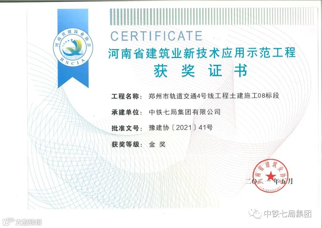 中铁七局郑州地铁4号线项目荣获河南省建筑业新技术应用示范工程金奖