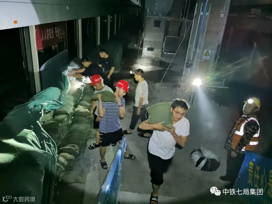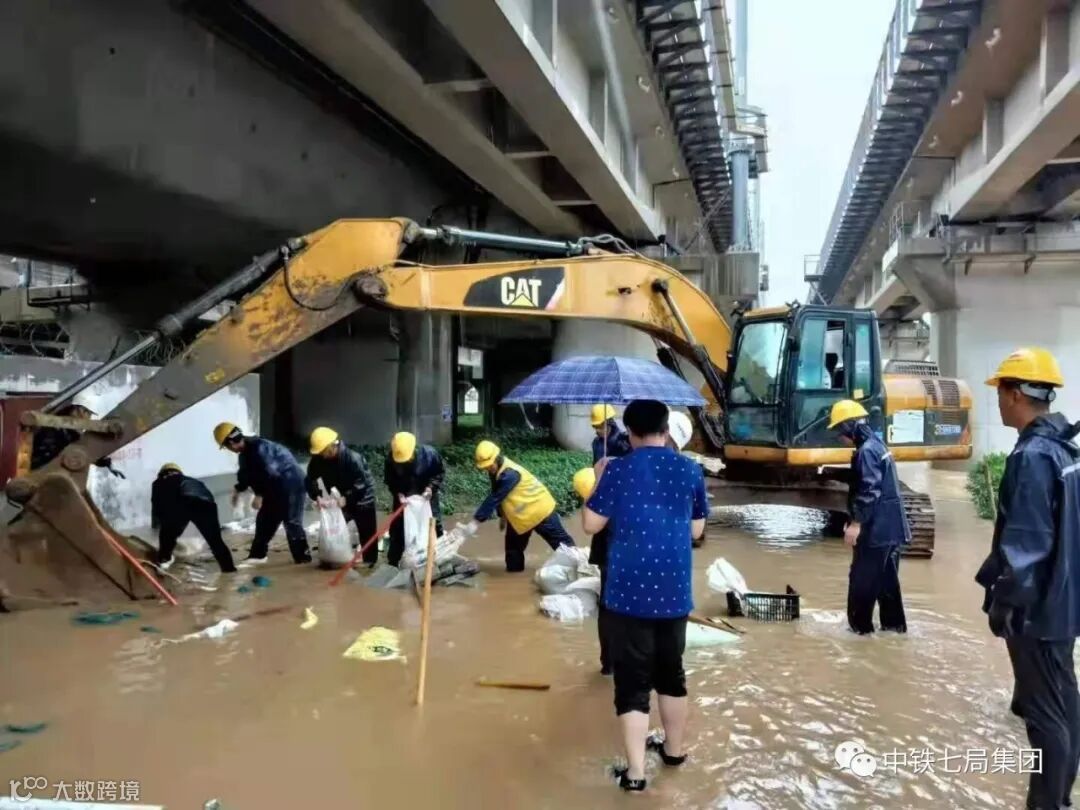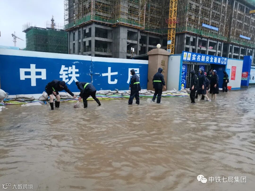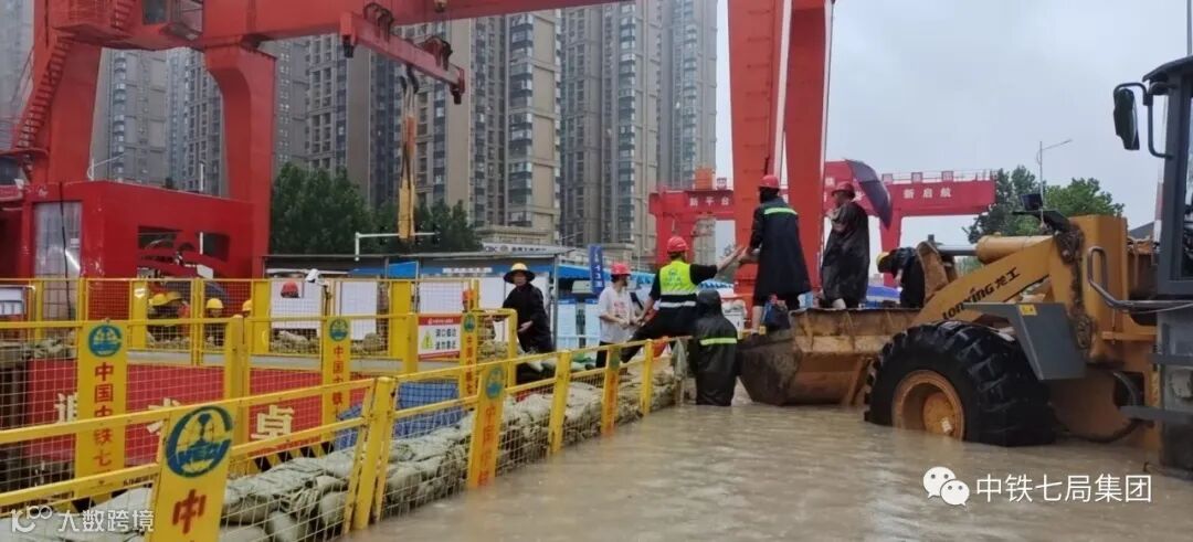7月20日,在持续近24小时的强降雨天气中,中铁七局郑州公司郑州地铁七号线和郑州市控制性节点工程白庙站两项目在做好基坑和车站防护的同时,时刻监测水位的涨幅情况,随时抢险救援。当天下午14时许,地铁7号线项目部领导巡查发现项目部附近的桥出现局部变形坍塌,周围出现严重积水,项目部上下全体积极投入到防汛保安全工作中,黑色的身影随处可见,用实际行动诠释着“七局人”的初心使命与责任担当。