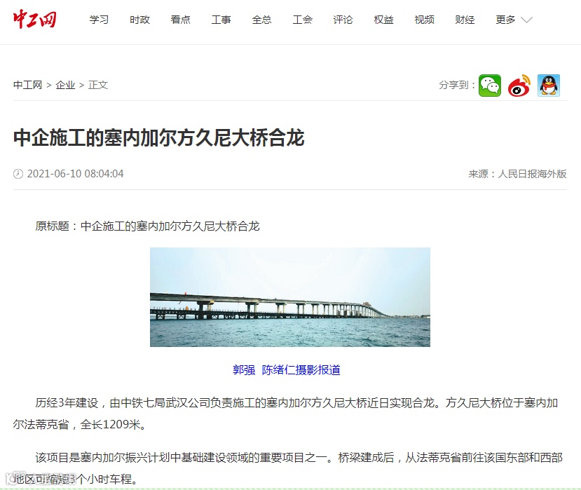 导读:点击上方蓝色字体可以订阅哦!人民日报中工网 历经3年建设,由中铁七局武汉公司负责施工的塞内加尔方久尼大