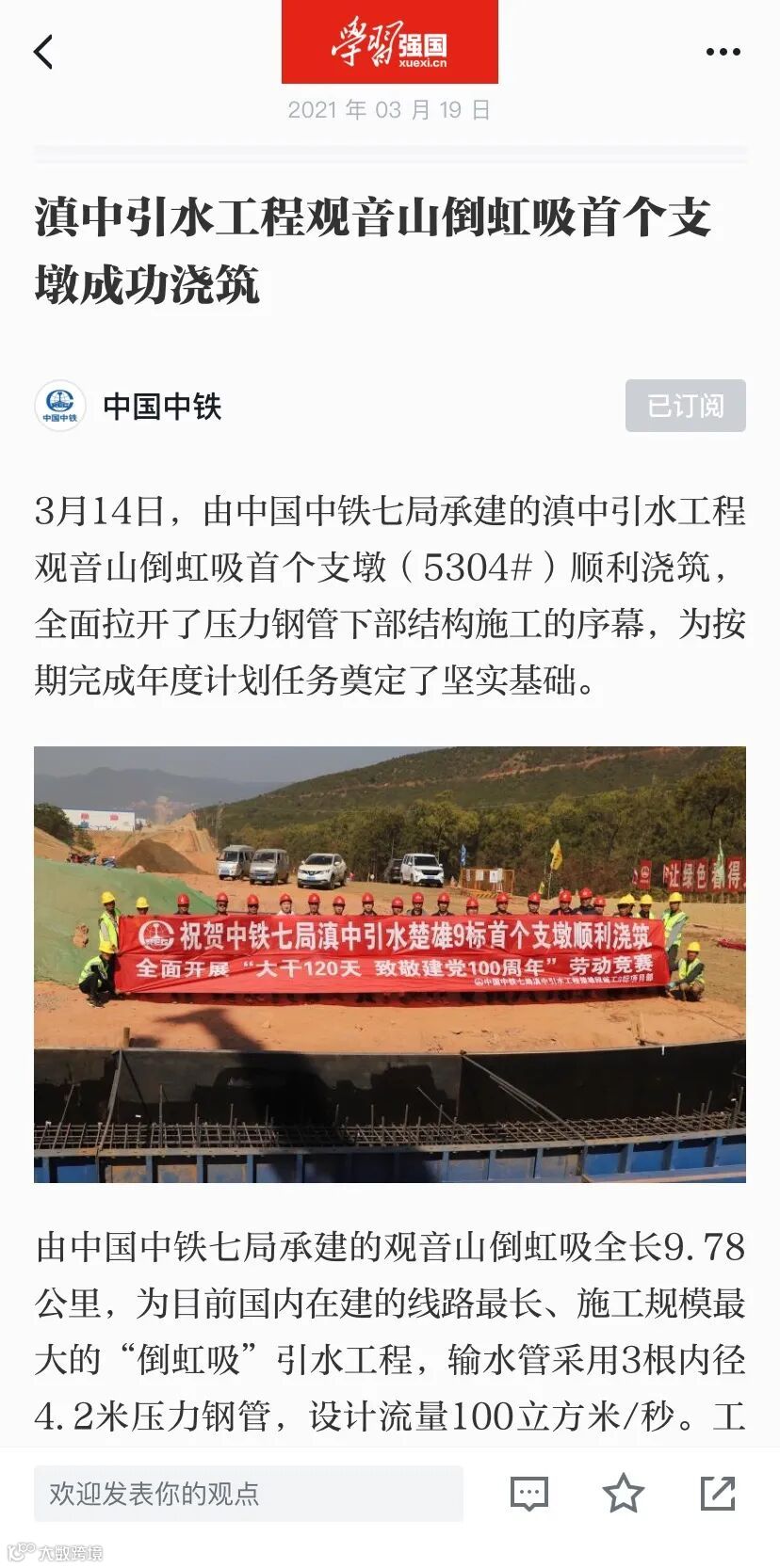 3月14日,由中国中铁七局承建的滇中引水工程观音山倒虹吸首个支墩(5304#)顺利浇筑,全面拉开了压力钢管下部结构施工的序幕,为按期完成年度计划任务奠定了坚实基础。