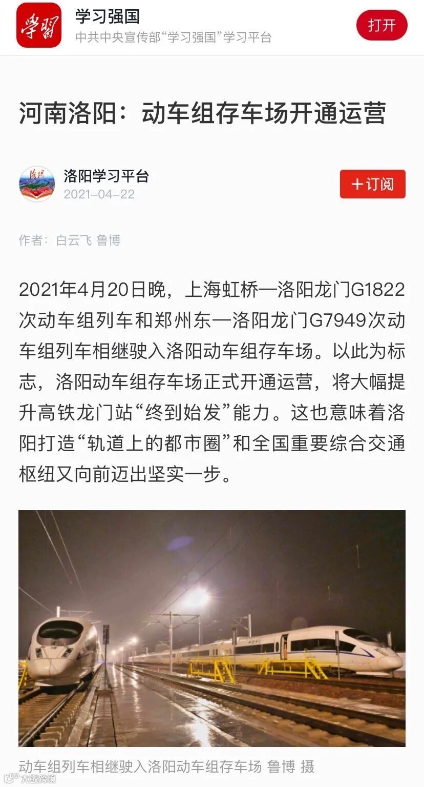 4月18日,一列和谐号动车组列车驶出洛阳动车组存车场,标志着由中铁七局集团承建的洛阳动车组存车场正式开通使用。该动车组存车场的开通使用,解决了洛阳没有动车组存车场的问题,将大大提升洛阳铁路枢纽的运营保障能力。