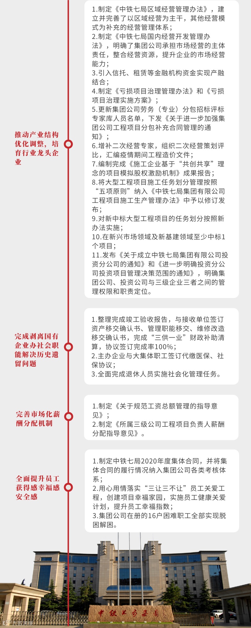 自中国中铁全面启动中铁系统深化改革三年行动以来,中铁七局严格落实上级部署,积极筹划,主动作为,以抓重点、补短板、强弱项为目标,聚焦企业生产经营发展的四大改革领域,对改革任务进行了全面梳理,明确了20个改革方向以及128项具体改革任务。