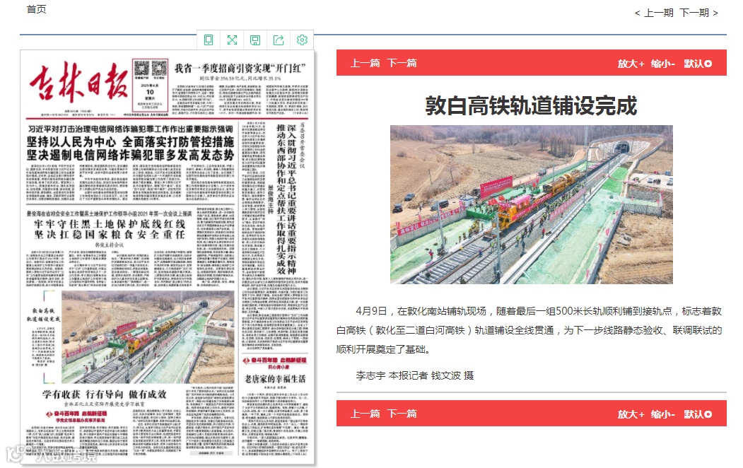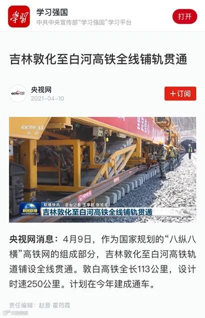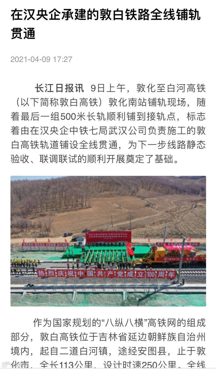 4月9日10时50分,在敦化至白河高铁敦化南站铺轨现场,随着最后一组500米长轨顺利铺到接轨点,标志着敦白高铁轨道铺设全线贯通,为下一步线路静态验收、联调联试的顺利开展奠定了基础。据不完全统计,该新闻被包括新闻联播、新华社、人民日报、学习强国在内的各大媒体争相报道百余次。
