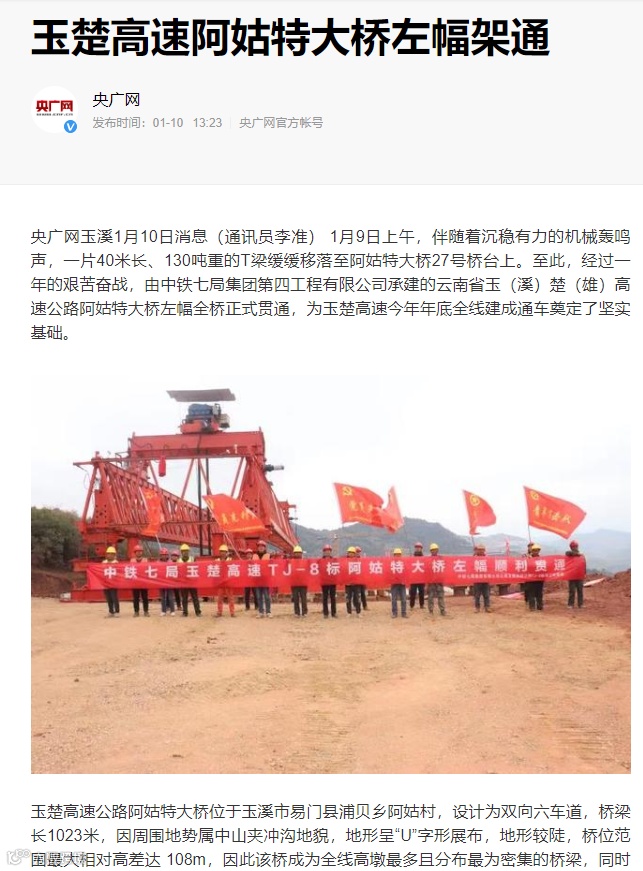 经过一年多艰苦奋战,由中铁七局集团第四工程有限公司承建的云南省玉(溪)楚(雄)高速公路阿姑特大桥9日实现单幅贯通,为玉楚高速今年年底全线建成通车奠定了基础。