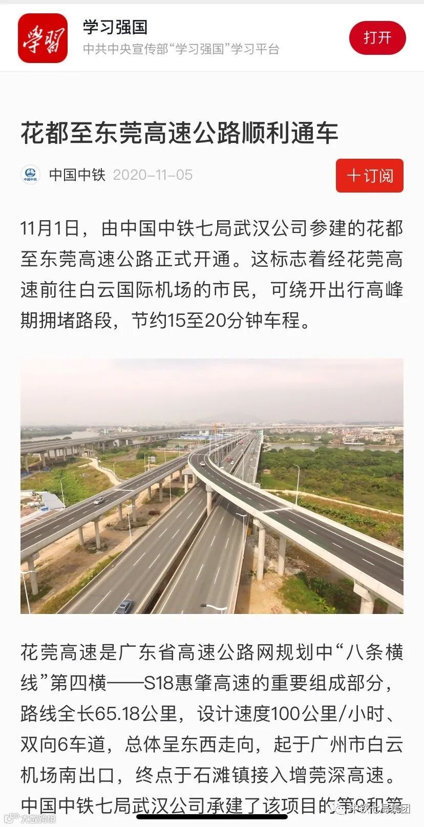 11月1日,由中国中铁七局武汉公司参建的花都至东莞高速公路正式开通。这标志着经花莞高速前往白云国际机场的市民,可绕开出行高峰期拥堵路段,节约15至20分钟车程。