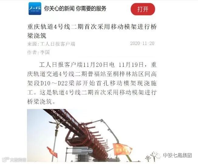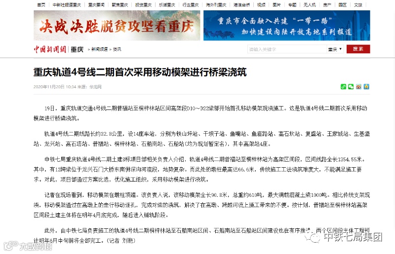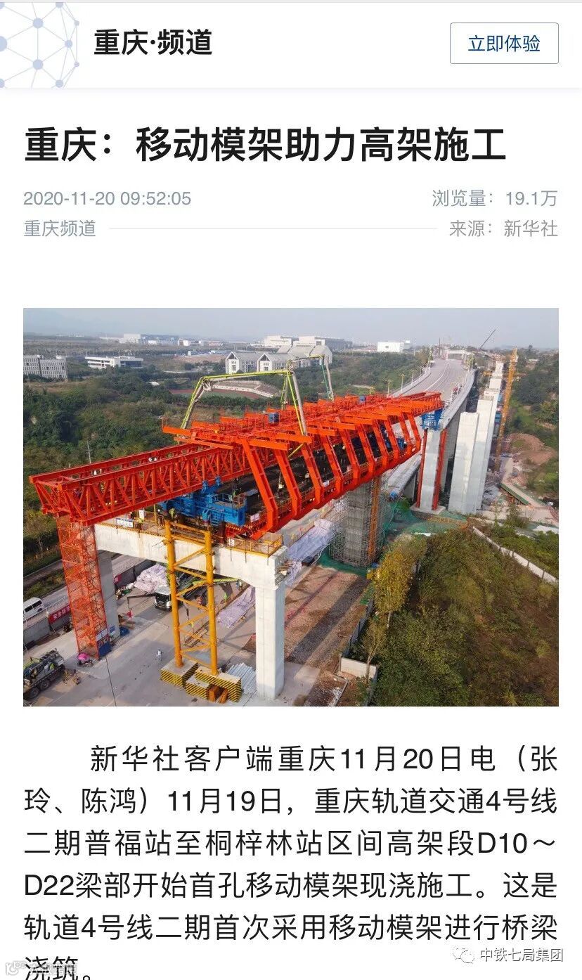 11月19日,重庆轨道交通4号线二期普福站至桐梓林站区间高架段D10~D22梁部开始首孔移动模架现浇施工。这是轨道4号线二期首次采用移动模架进行桥梁浇筑。