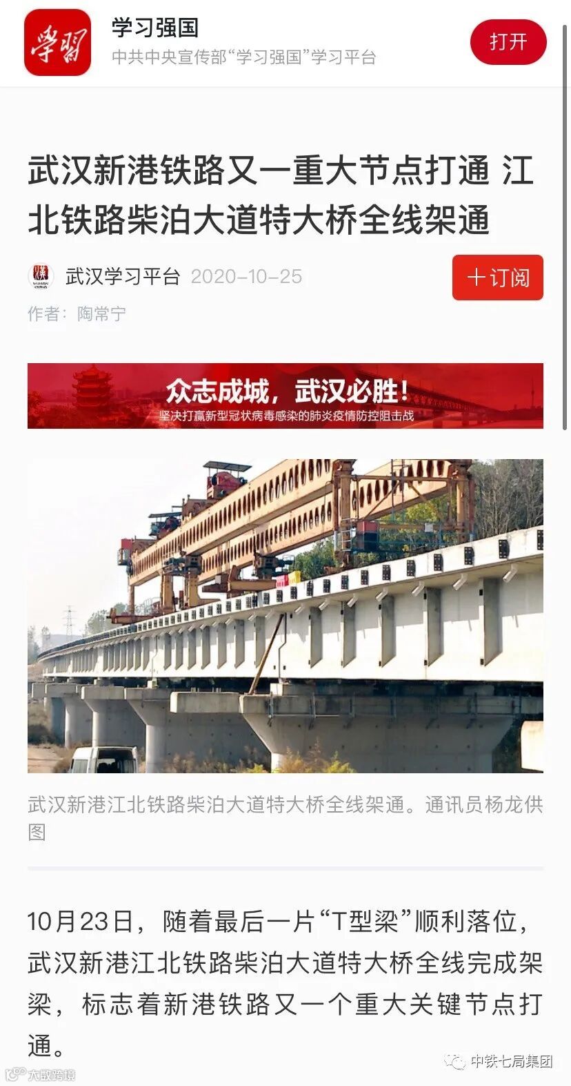 10月23日,随着最后一片“T型梁”顺利落位,武汉新港江北铁路柴泊大道特大桥全线完成架梁,标志着新港铁路又一个重大关键节点打通。