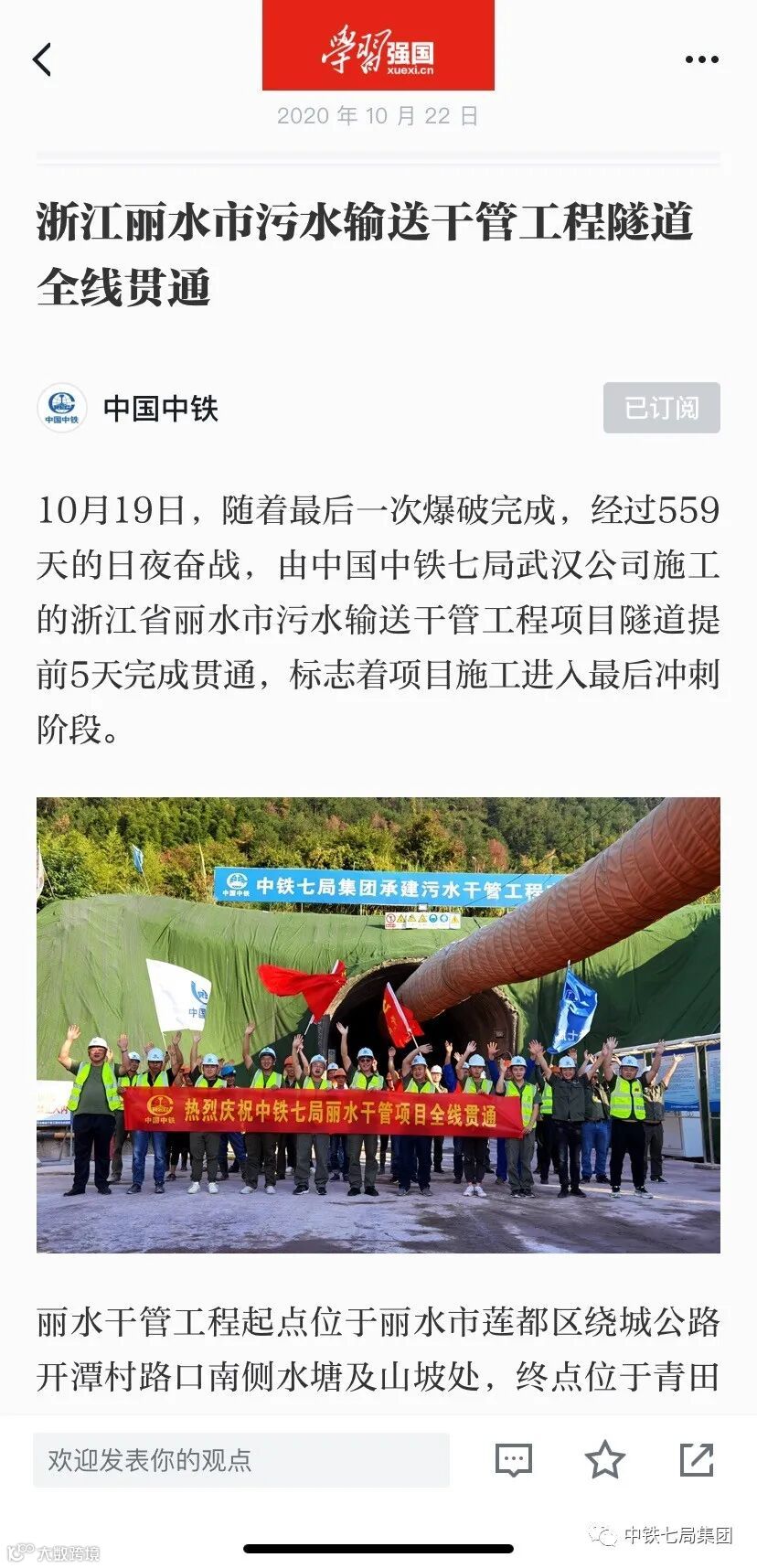 10月19日,随着最后一次爆破完成,经过559天的日夜奋战,由中国中铁七局武汉公司施工的浙江省丽水市污水输送干管工程项目隧道提前5天完成贯通,标志着项目施工进入最后冲刺阶段。