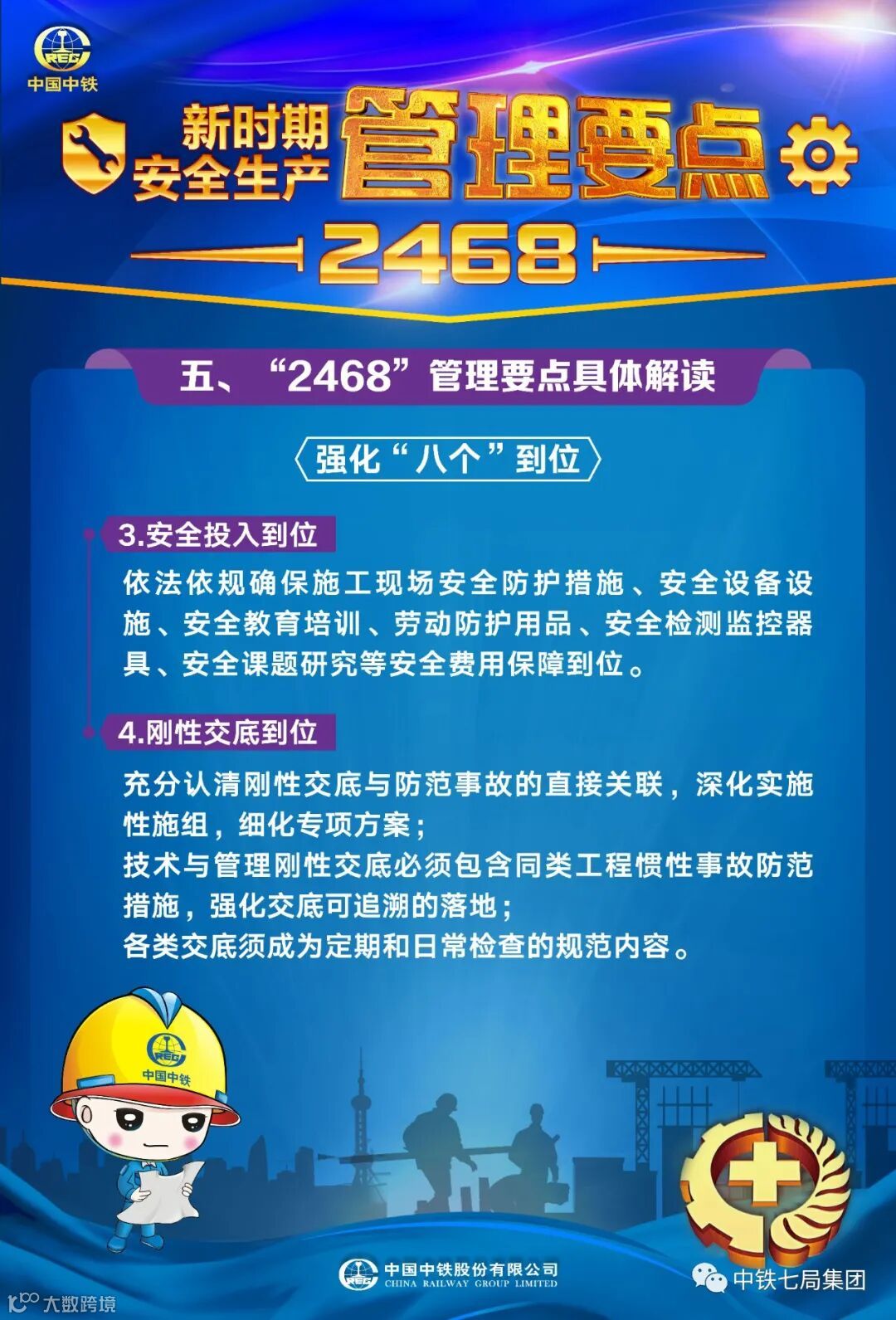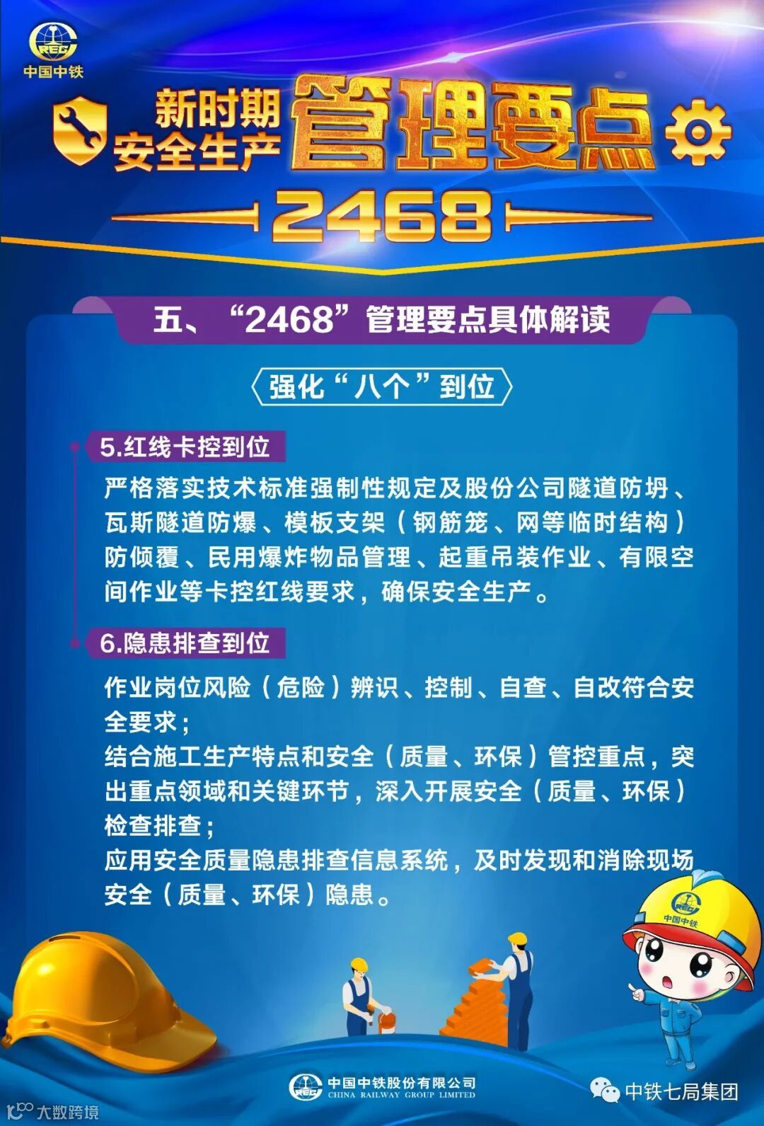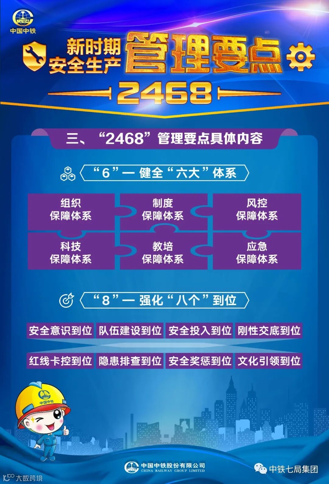 近日,中国中铁党政工团联合印发了《中国中铁新时期安全生产“2468”管理要点》,这是中国中铁落实党和国家对新时期安全生产工作的新要求,落实企业安全生产主体责任,提出的新时期企业安全生产管理纲领性文件。企业上下要紧密围绕安全生产“2468”管理要点,不断完善安全生产体制机制,持续加强执行能力建设,夯实安全生产基础工作,切实提升企业新时期本质安全水平。