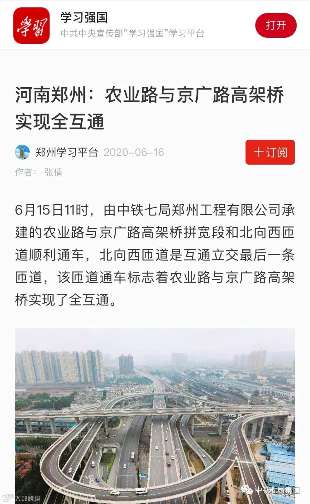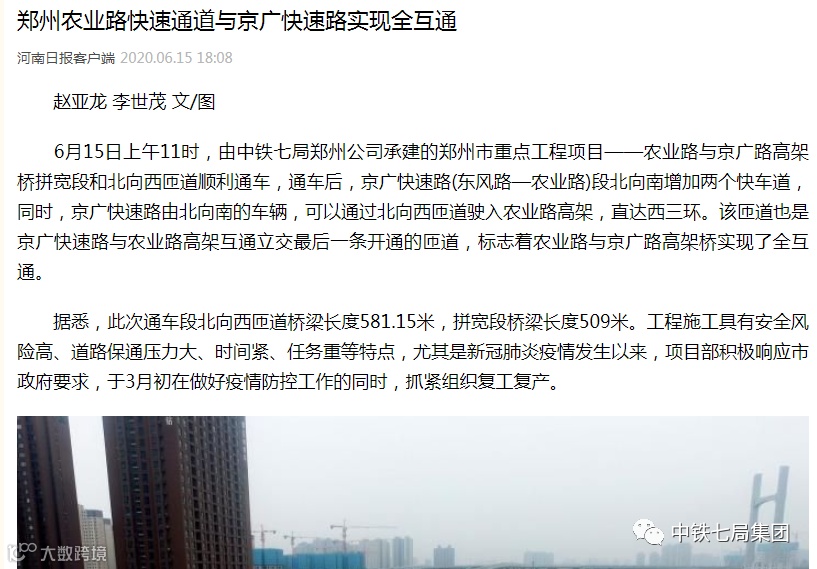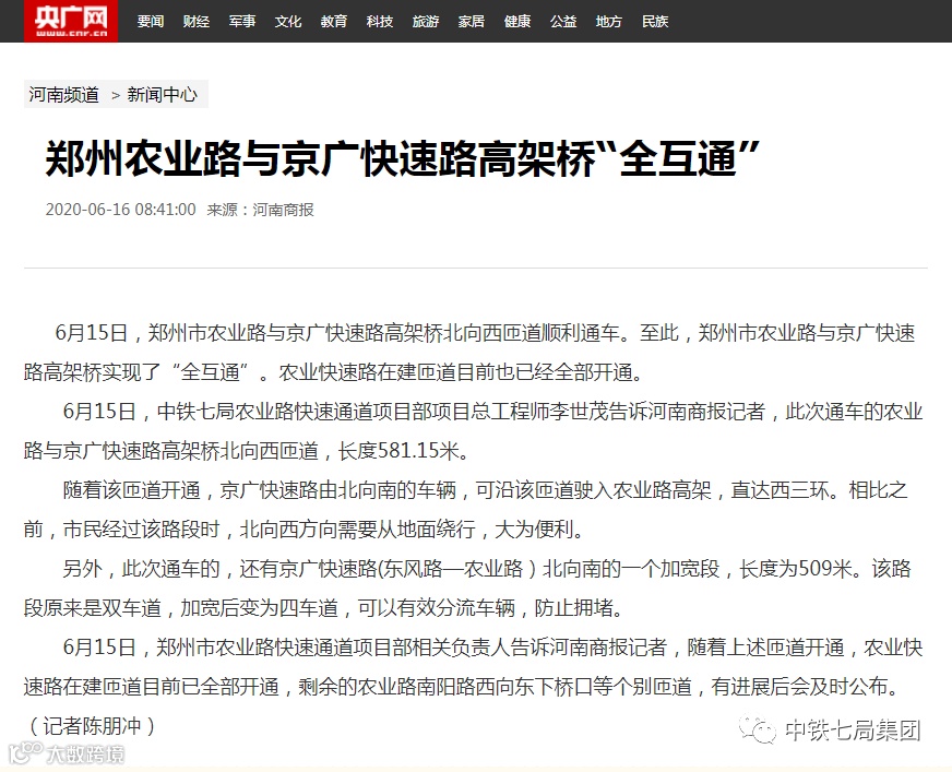 6月15日上午11时许,由中铁七局郑州工程有限公司承建的郑州市重点工程项目——农业路与京广快速路高架桥拼宽段和北向西匝道顺利通车,通车后,京广快速路(东风路—农业路)段北向南增加两个快车道,与此同时,沿京广快速路由北向南的车辆可以通过北向西匝道驶入农业路高架,直达西三环。据悉,此次开通的北向西匝道也是京广快速路与农业路高架互通立交最后一条开通的匝道,标志着农业路与京广路高架桥实现了全互通。