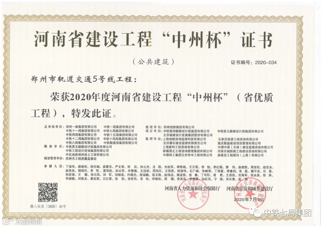 日前,河南省人力资源和社会保障厅、住房和城乡建设厅对2020年度“中州杯”全省优质工程奖予以评选表彰,由中铁七局承建的郑州地铁5号线工程土建施工08标段榜上有名,一举摘得这一河南省建设工程最高质量奖,为企业赢得了荣誉。郑州地铁5号线是郑州市唯一一条环形地铁,它的建成不仅缓解了省会交通压力、便利了市民出行,也圆了郑州人“环游”全城的梦想。中铁七局承建的08标全长3.63公里,包含两站三区间,于2014年12月开建,2019年4月12日建成竣工。据悉,该项目还应用了多项绿色施工、建筑业新技术、新工法,累计荣获省部级优秀QC成果2项、科技创新成果1项及国家级BIM大赛奖1项,此次夺得“中州杯”奖项,再一次展示了中铁七局雄厚的技术实力和良好的社会信誉。