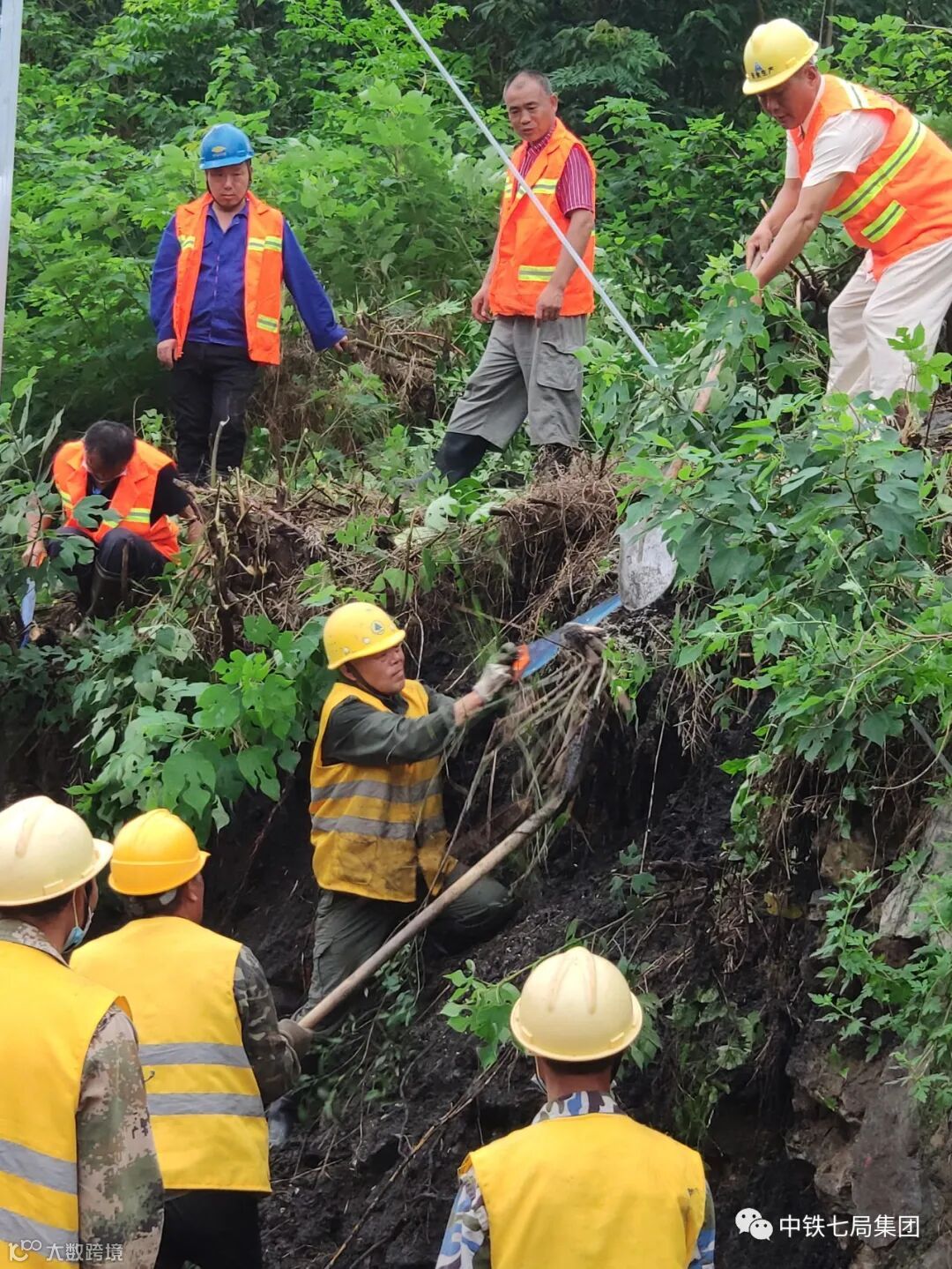 受连日降雨影响,6月28日13时10分,中铁七局武汉公司孝感花园站改项目部接到信阳工务段花园车间紧急求助电话,京广线下行K1098+600处边坡积水严重,导致部分挡土墙发生溜塌,溜塌现场旁耸立一座接触网钢立柱,并正对一组信号机,形成安全隐患,继续发展下去必将危及铁路行车安全。接到求助电话后,项目部第一时间成立了抢险指挥领导小组,紧急调配了抢险所用的蛇皮袋、篓筐等物资,并组织救援力量迅速赶赴现场参加抢险。由于作业面狭窄,现场电缆线复杂,大型施工机械设备无法进入,抢险队员们分组作业,用肩扛手提方式连续奋战三个多小时,顺利排除了安全隐患。