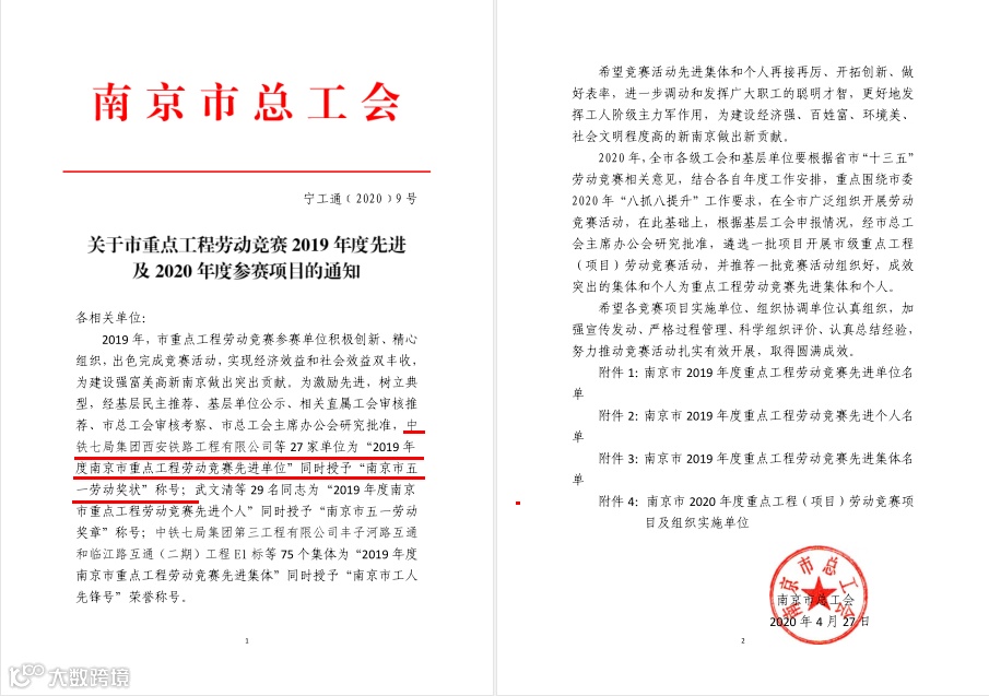 5月9日,从南京市总工会获悉,中铁七局西安公司获评“2019 年度南京市重点工程劳动竞赛先进单位”,并授予了该公司“南京市五一劳动奖状”。