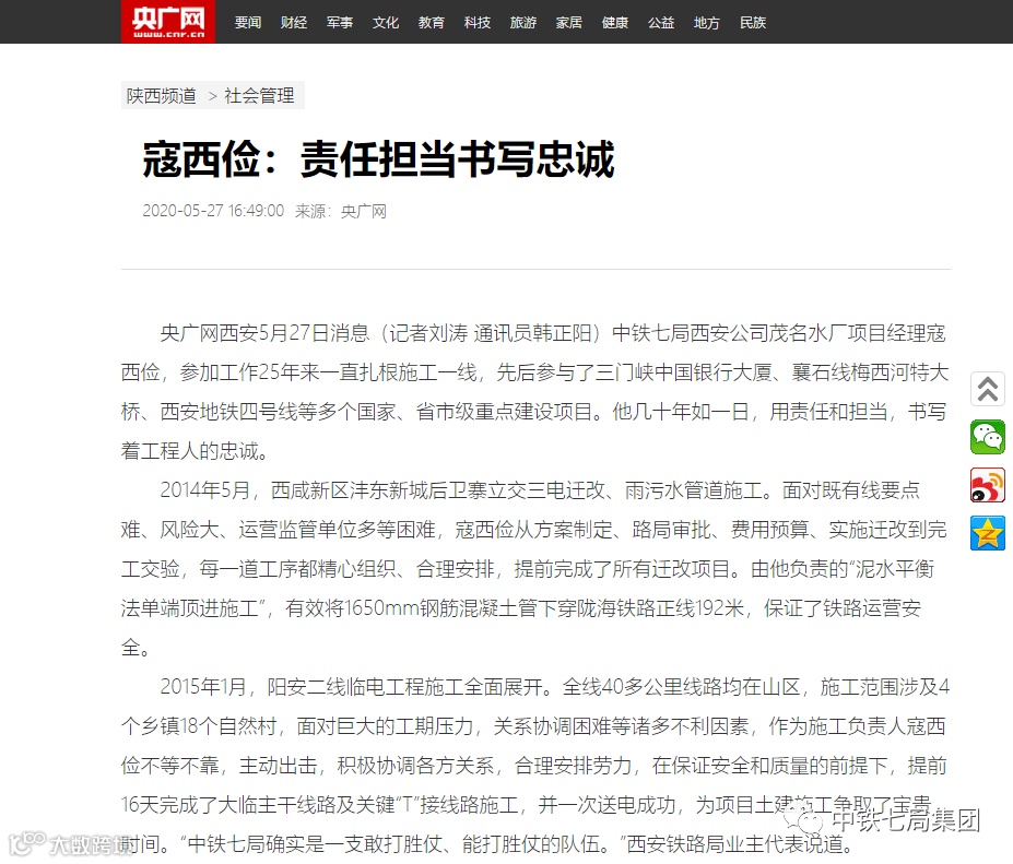 中铁七局西安公司茂名水厂项目经理寇西俭,参加工作25年来一直扎根施工一线,先后参与了三门峡中国银行大厦、襄石线梅西河特大桥、西安地铁四号线等多个国家、省市级重点建设项目。他几十年如一日,用责任和担当,书写着工程人的忠诚。